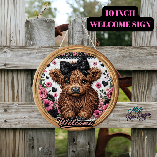 Highland Cow Floral Welcome Sign – 10” Round Rustic Farmhouse Door Hanger (Blue, Pink, or Purple Flowers)