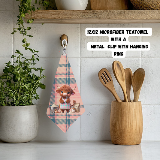 Highland Cow Plaid Teatowel Collection – 12x12 Microfiber with Hanging Clip