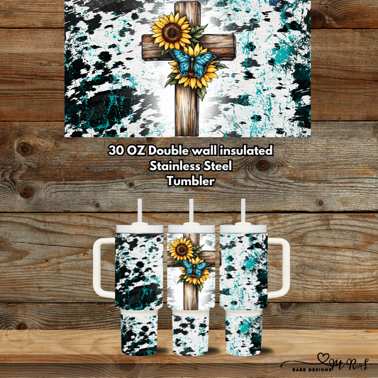 Turquoise Cross Cowhide Splash — 30oz Handled Stainless Steel Tumbler Collection