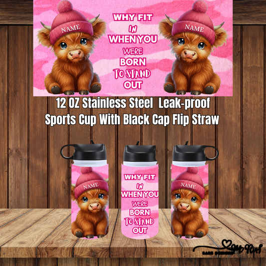 Born to Stand Out – Highland Cow 12oz Sports Cup Collection (Custom Name, Flip-Straw)