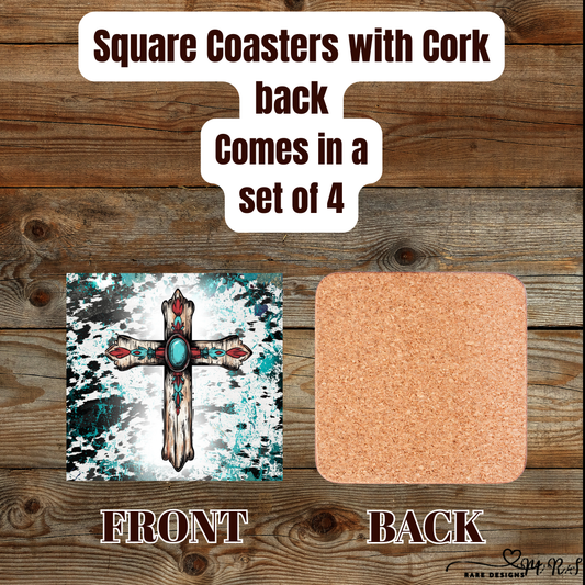 Coasters – Set of 4 Cork-Backed – Rustic Turquoise Cross