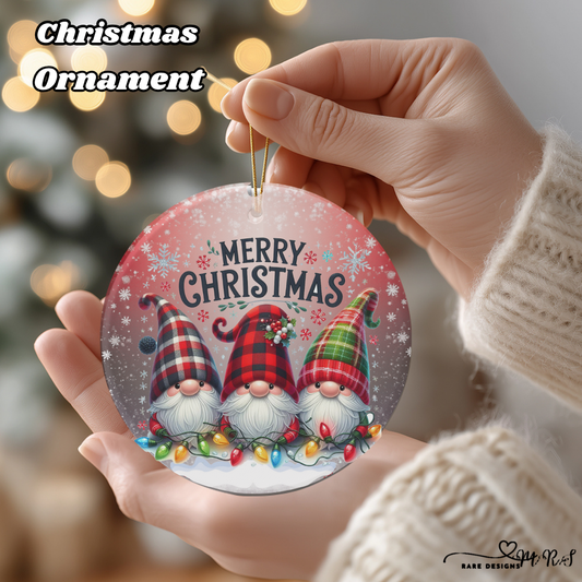 Plaid Hat Gnomes “Merry Christmas” Round Ornament — Holiday Keepsake