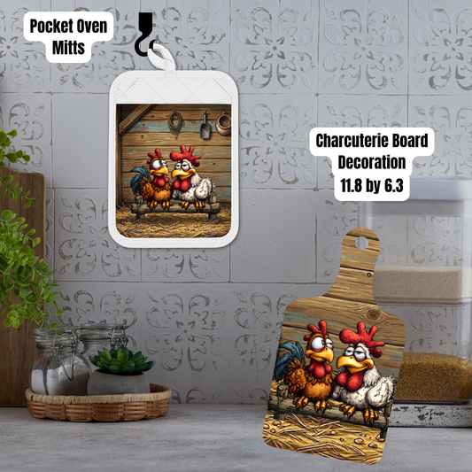Farmhouse Rooster & Hen Kitchen Gift Set – Pocket Oven Mitt with Cookie Mix + Decorative Charcuterie Board