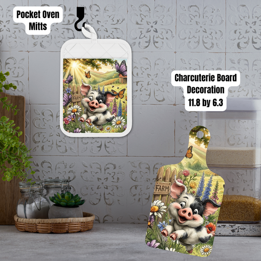 Cute Farm Piglet Kitchen Gift Set – Pocket Oven Mitt with Cookie Mix + Decorative Charcuterie Board