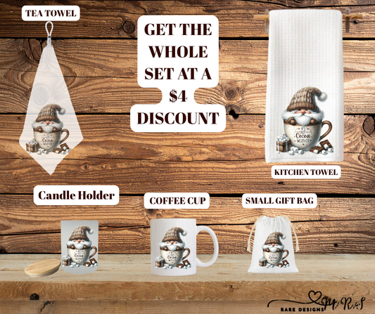 Cozy Cocoa Gnome Matching Gift Set — Mug + Kitchen Towel + Tea Towel + 4×6 Gift Bag (Save $4 on the whole set!)