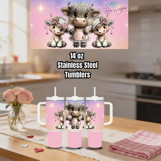 Adorable Cow Family 30oz Stainless Steel Tumbler – Pink Pastel Highland Cow Design with Straw & Handle