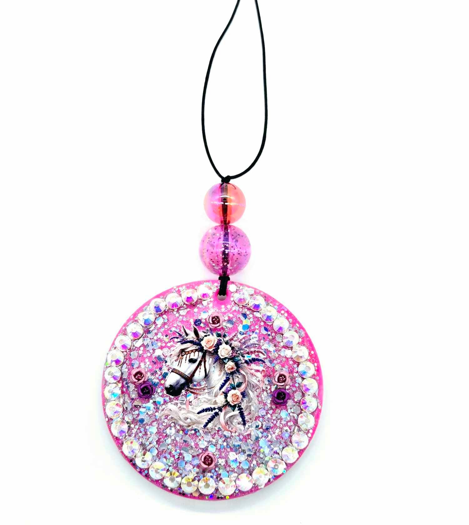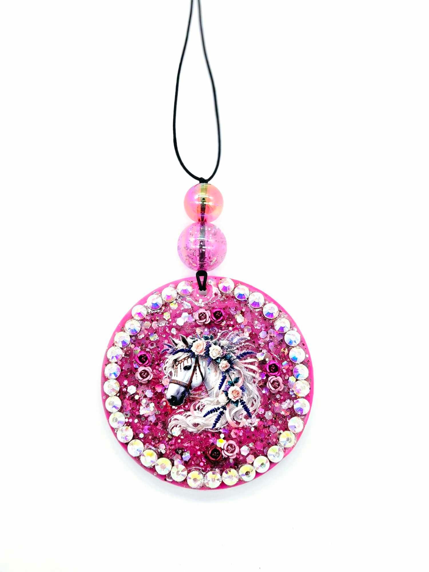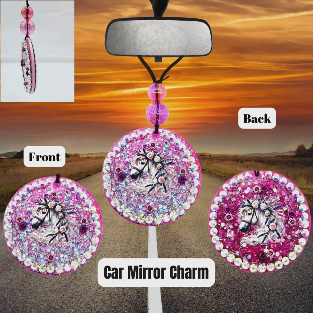 Add a dash of sparkle and whimsy to your ride with our Enchanted Rose Horse Car Charm! This handcrafted beauty features a majestic horse adorned with blooming roses and shimmering rhinestones, making both sides equally magical—one with a slightly deeper pink background for extra depth and contrast.