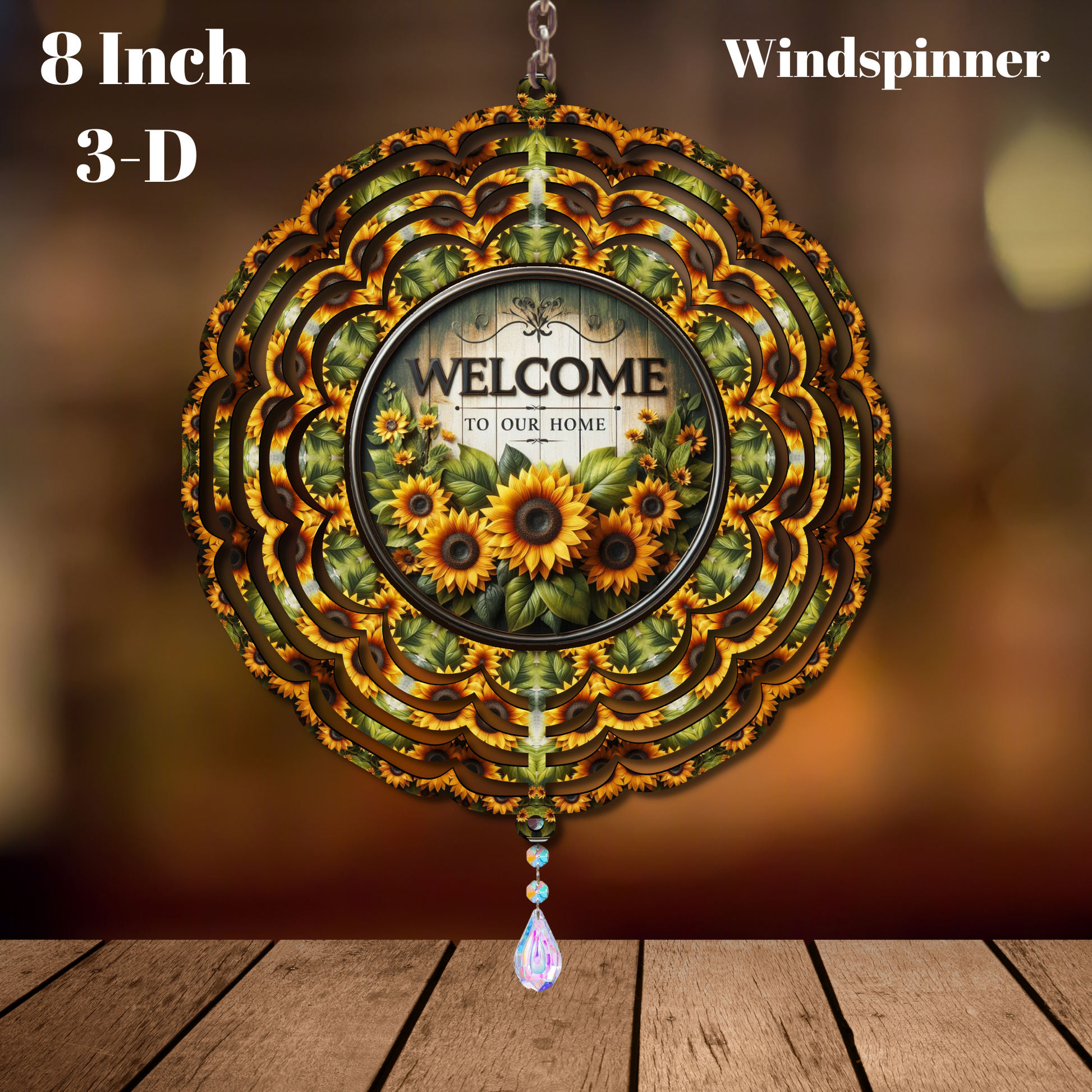 Bring a burst of sunflower sunshine to your space with our Sunflower Whirl Welcome Spinner! This 8-inch 3D windspinner features a vibrant sunflower design and a charming "Welcome to Our Home" message at its heart. Crafted for visual delight, it twirls beautifully in the breeze, creating a stunning optical illusion with every spin. Perfect for porches, gardens, patios, or entryways!