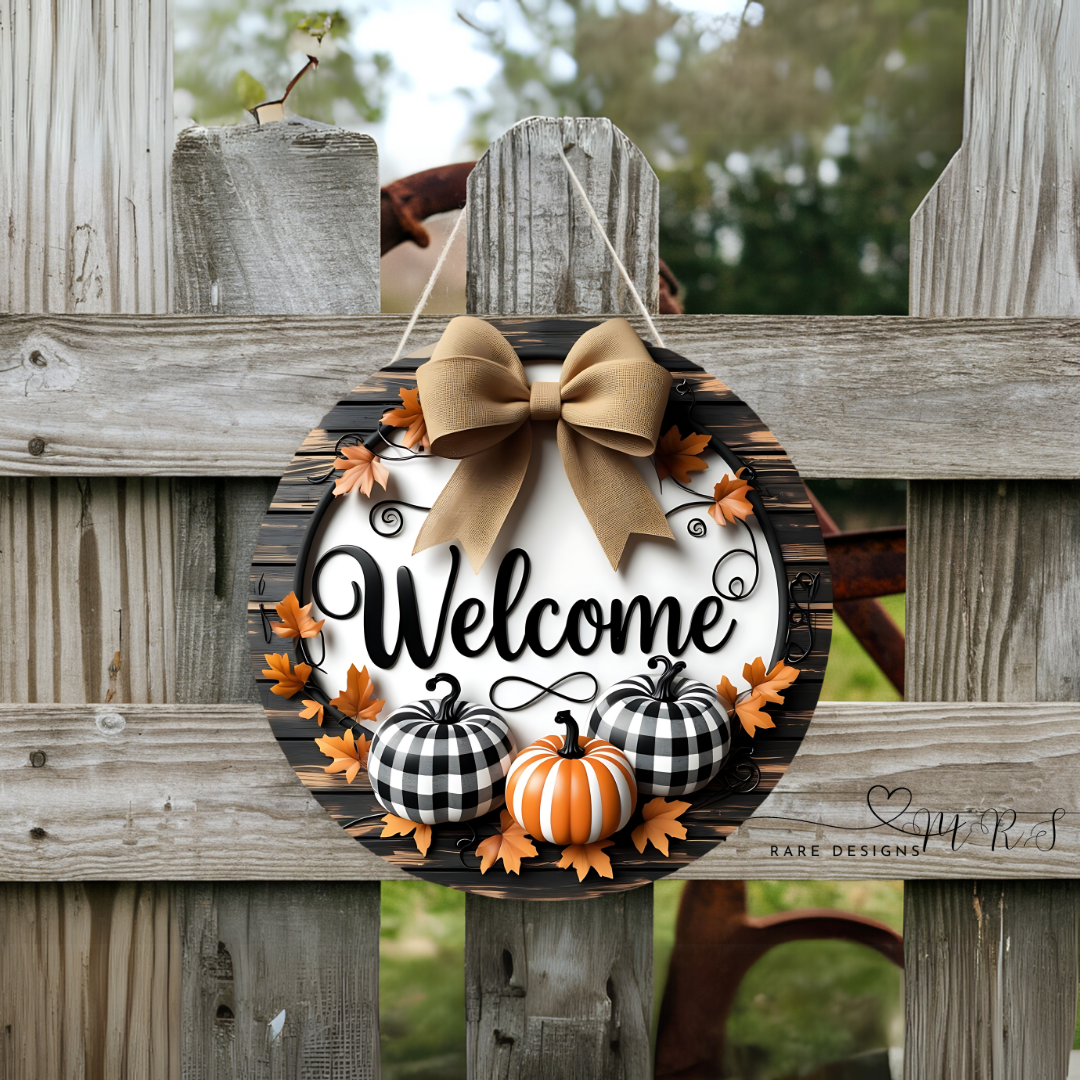 Bring cozy fall charm to your home with our Autumn Welcome Pumpkin Door Sign. This round wooden-style sign features a warm burlap bow, classic orange and black plaid pumpkins, and vibrant autumn leaves, all surrounding a bold βWelcomeβ message. Perfect for hanging on your front door, porch, fence, or entryway, it sets the tone for a festive and inviting season. Handmade with care, this piece makes a wonderful gift for housewarmings, Thanksgiving, or anyone who loves fall dΓ©cor.