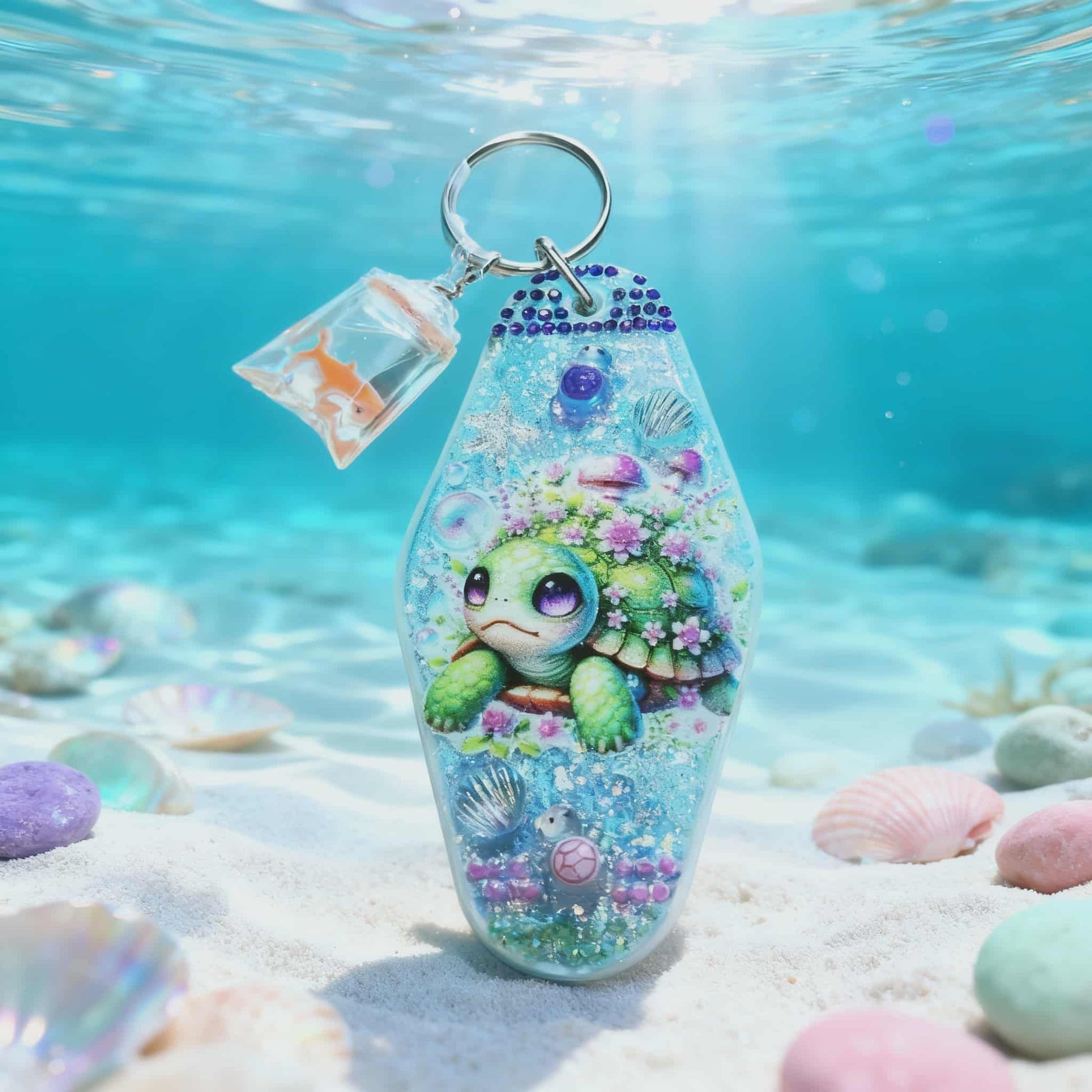 Dive into an ocean of charm with this breathtaking handmade resin keychain, featuring an adorable baby sea turtle surrounded by sparkling seashells, coral, and ocean shimmer. Crafted with aqua blue resin and layers of fine iridescent glitter, each piece captures the dreamy movement of underwater magic. The UVDTF artwork adds a lifelike, vibrant touch, sealed in glossy perfection for durability. Accented with a tiny floating goldfish bottle charm, itâs a whimsical accessory that radiates serenity and seaside beauty. Perfect for ocean lovers, resin art collectors, or anyone seeking a bit of coastal bliss in a handmade gift.