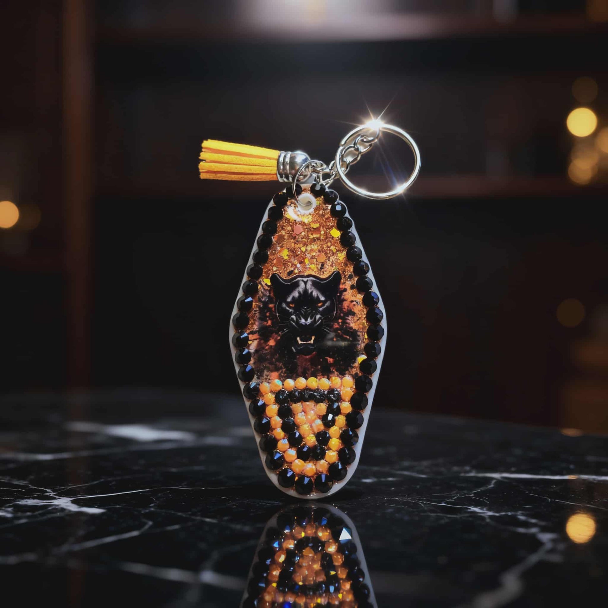 š¾ Powell Panther Pride Resin Keychain ā Handmade Black & Orange Glitter Mascot Charm with Tassel Accent š¾