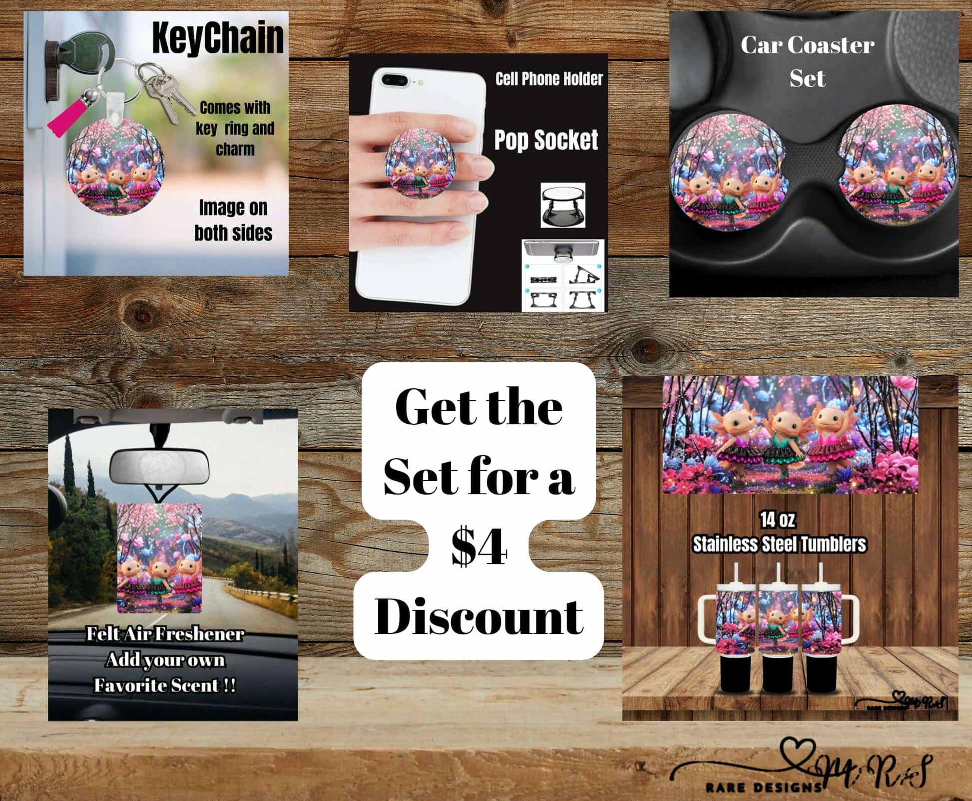 Turn your everyday routine into a little fairytale with our Axolotl Ballet Mini Sips & Accessories Set! This coordinated bundle features three adorable tutu-wearing axolotls dancing in a dreamy cherry blossom forest, printed across all your must-have goodies. The set includes a 14 oz stainless steel handled tumbler with lid and straw, a matching cell phone pop socket holder, car coaster set (2 coasters), a double-sided keychain with charm, and a felt air freshener you can scent with your own favorite fragrance.