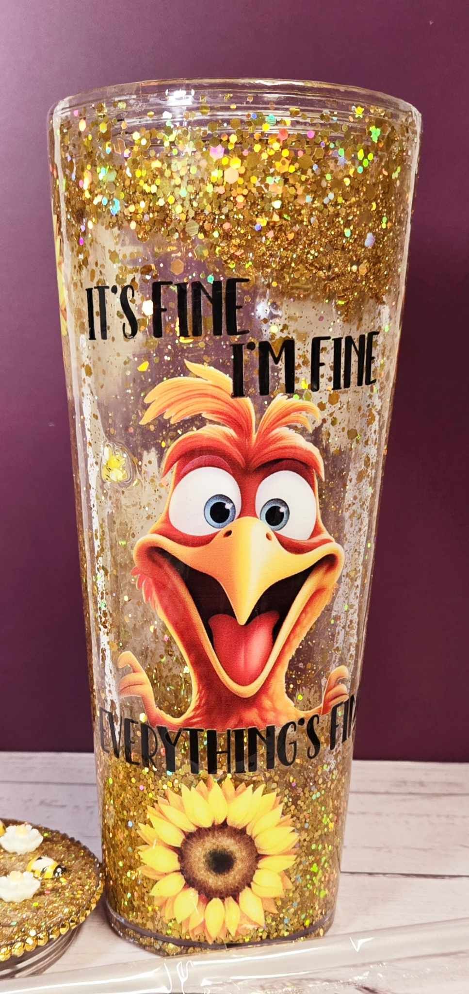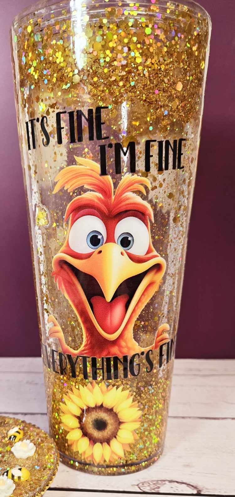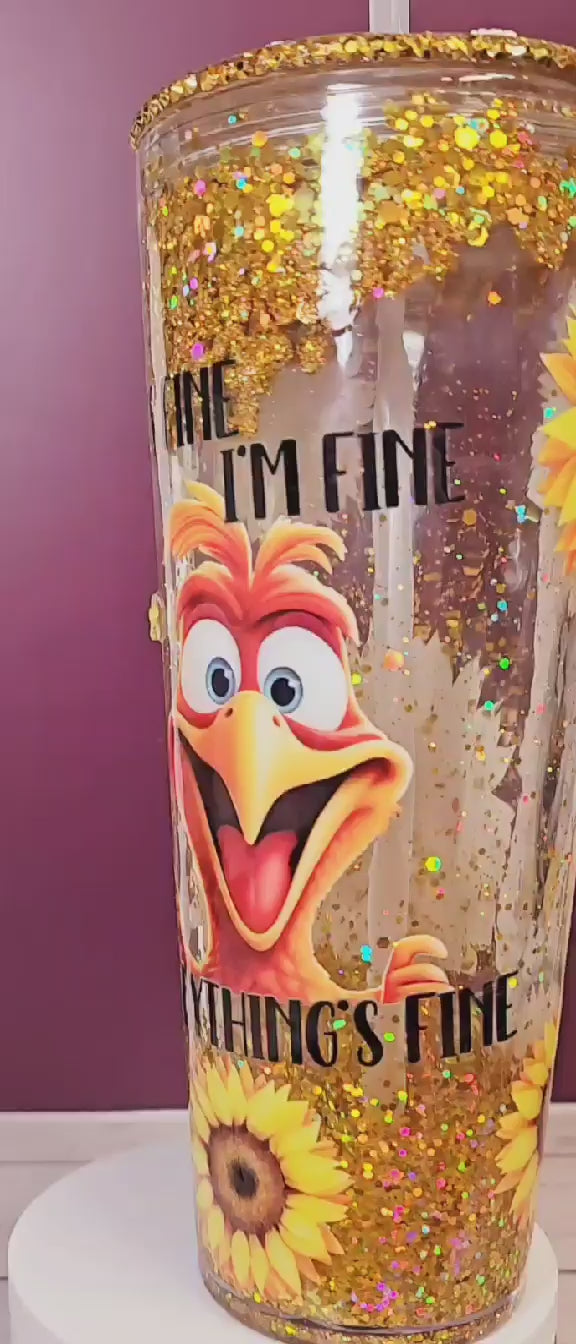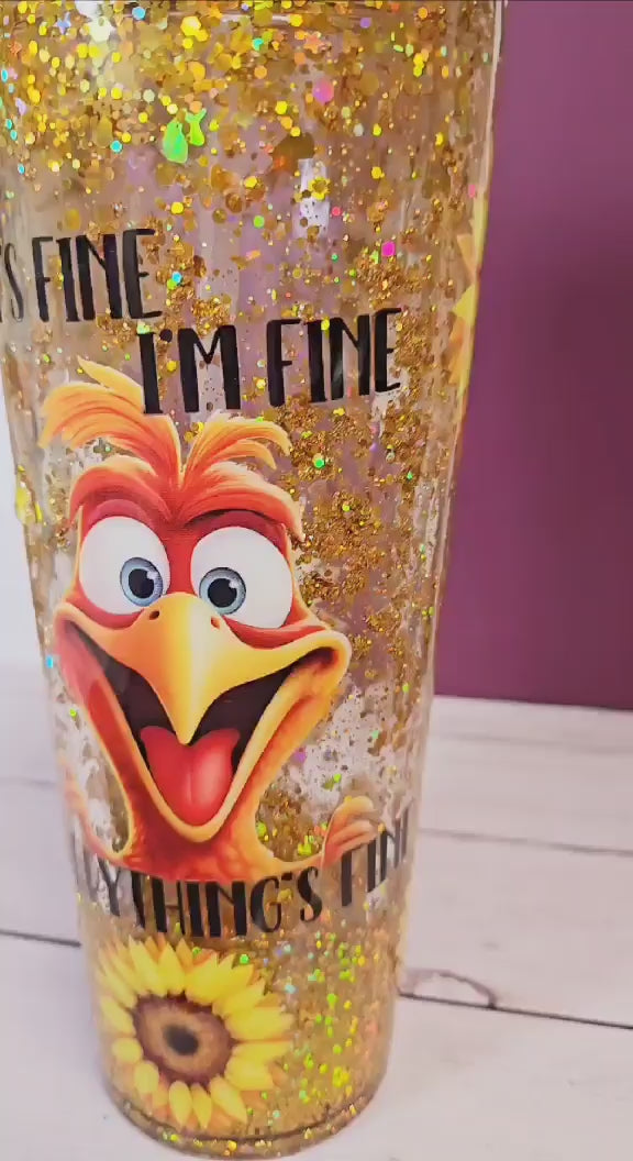 Stay positive and brighten your day with our cheerful Bee Happy Snowglobe Tumbler. This 24oz double-walled acrylic tumbler is designed to keep your beverages at the ideal temperature while adding a sparkle to your routine. Featuring the amusing text "It's fine. I'm fine. Everything is fine." and a vibrant character design, this tumbler is sure to bring a smile to your face. The real standout is the glittering decorative lid adorned with cute bees and delicate flowers, making this tumbler a delightful addition to your collection.