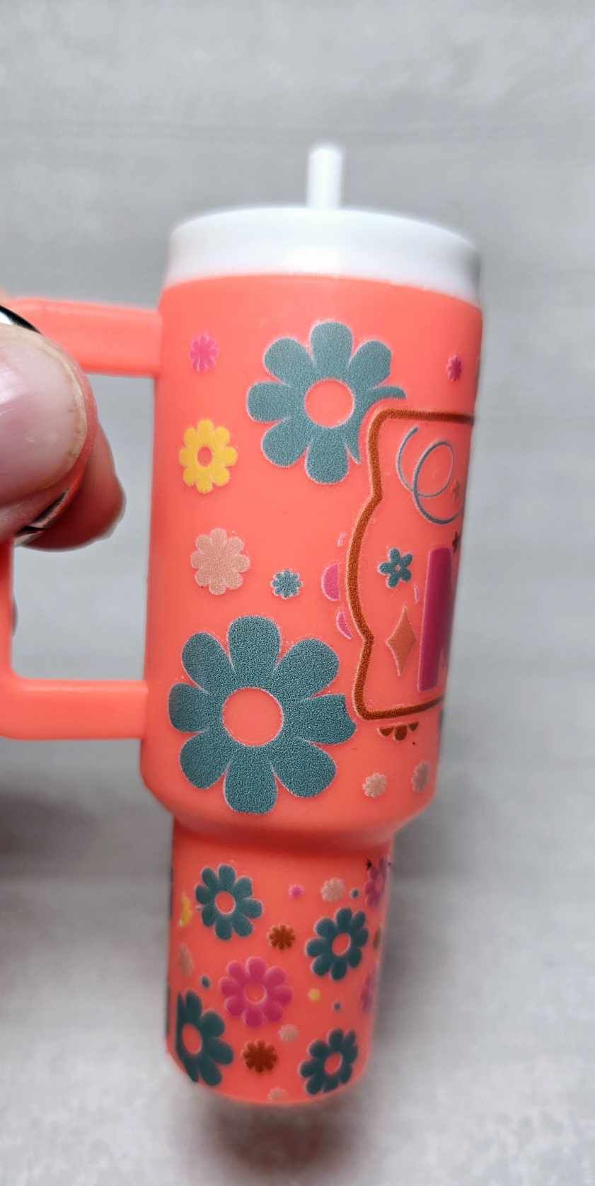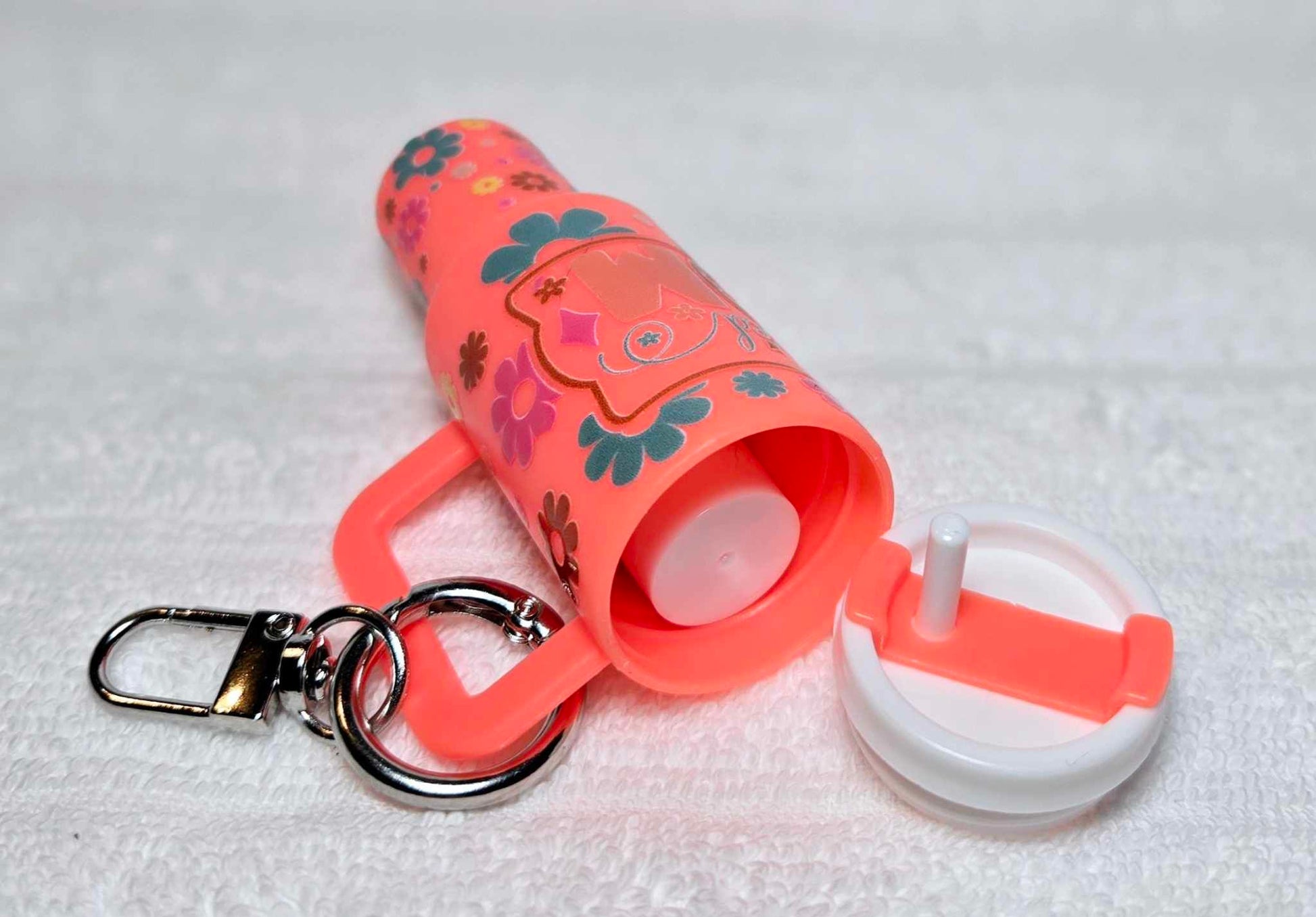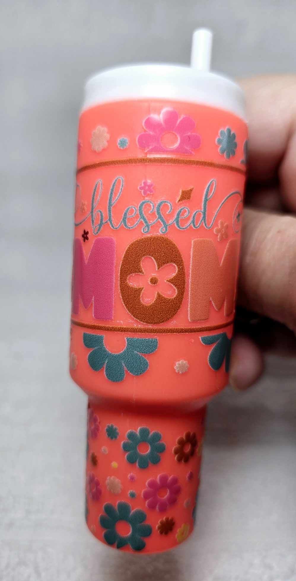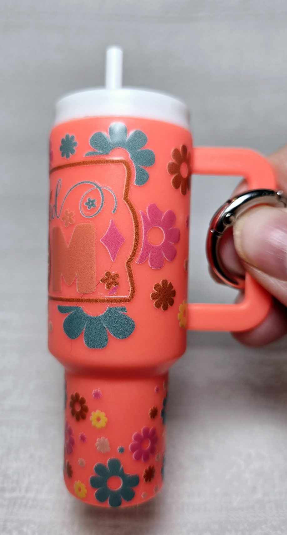 Celebrate motherhood with this delightful 'Blessed Mom' mini tumbler keychain. Adorned with a colorful floral design and the heartwarming message, this tumbler is not just a practical accessory but also a symbol of appreciation for every mom's daily blessings. Its compact design is perfect for holding small essentials like chapstick, coins, or emergency cash, all securely fastened with its sturdy lid. A charming gift that says "Thank you" in the sweetest way possible, this keychain tumbler is a small token of big gratitude for the amazing moms out there. Comes with a handy carabiner for easy attachment to keys or bags.