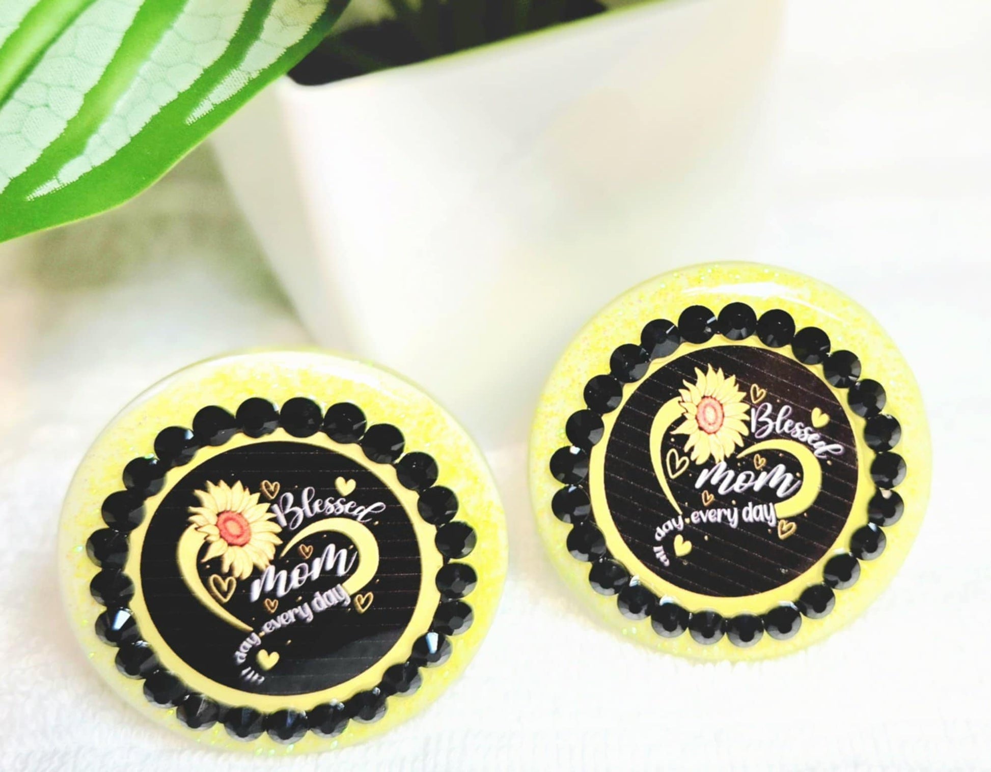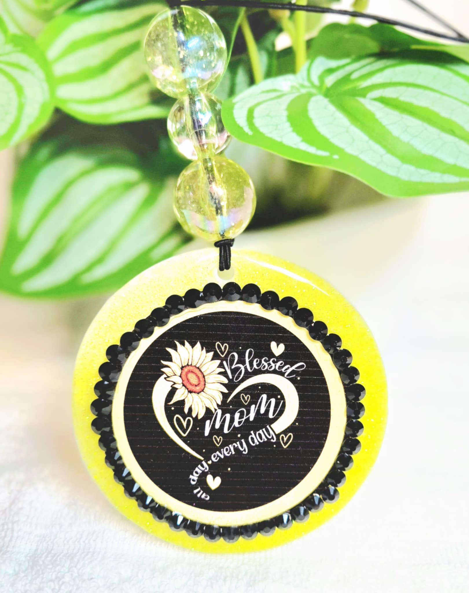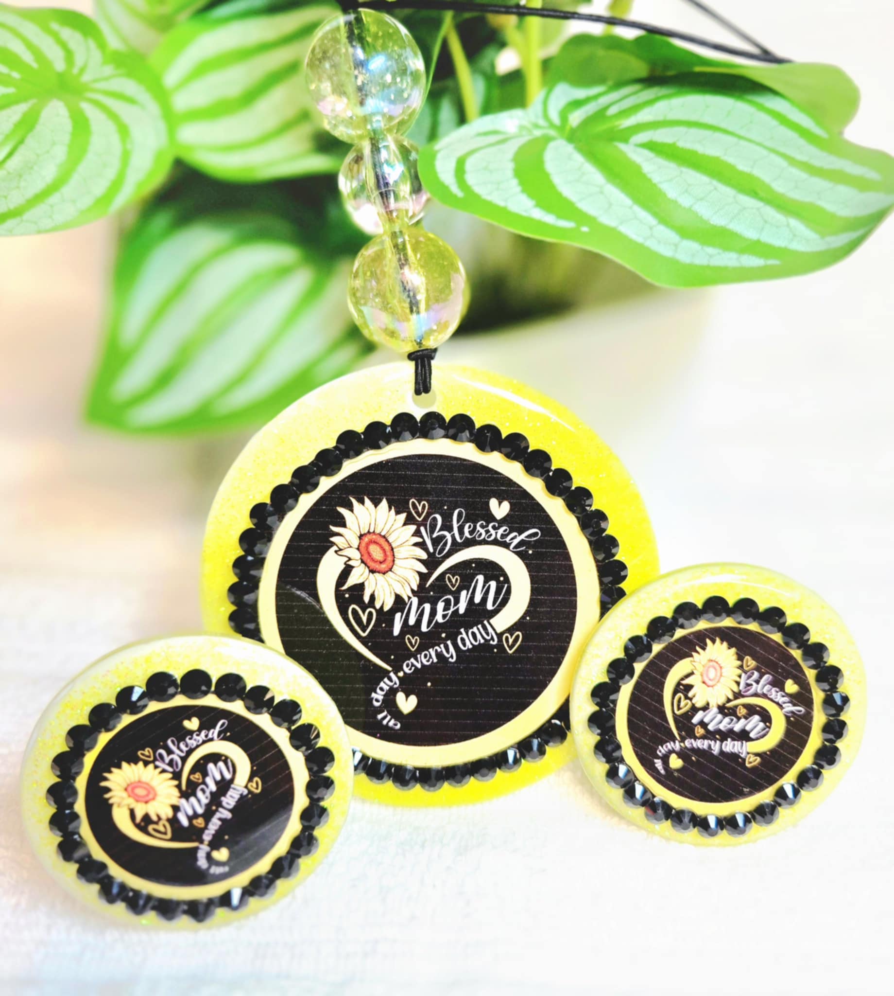 Celebrate the heart of your car—and your heart—with our Blessed Mom Sunflower Car Charm & Clip Set. This radiant yellow set features a beautiful sunflower design and the heartfelt message “Blessed Mom Every Day,” surrounded by a sparkling frame and heartfelt details.