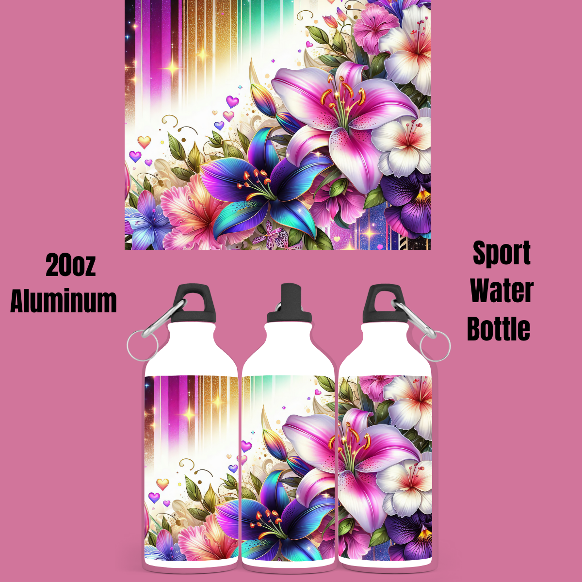 Add a splash of floral magic to your hydration routine with our Bloom Burst 20oz Aluminum Sport Water Bottle! Lightweight, durable, and beautifully designed, this bottle features an eye-catching wraparound of bold tropical flowers, sparkling hearts, and vibrant rainbow gradients.