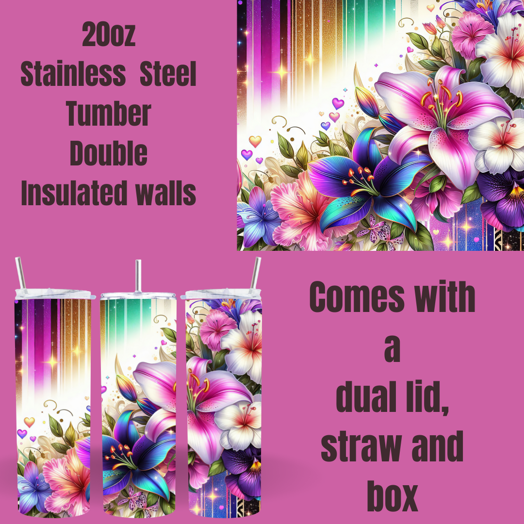 Sip in radiant style with our Bloom Burst 20oz Stainless Steel Tumbler! This vibrant tumbler is wrapped in a lush, full-color design of tropical flowers, soft rainbow gradients, and sparkly heart accents—guaranteed to turn heads wherever you go.