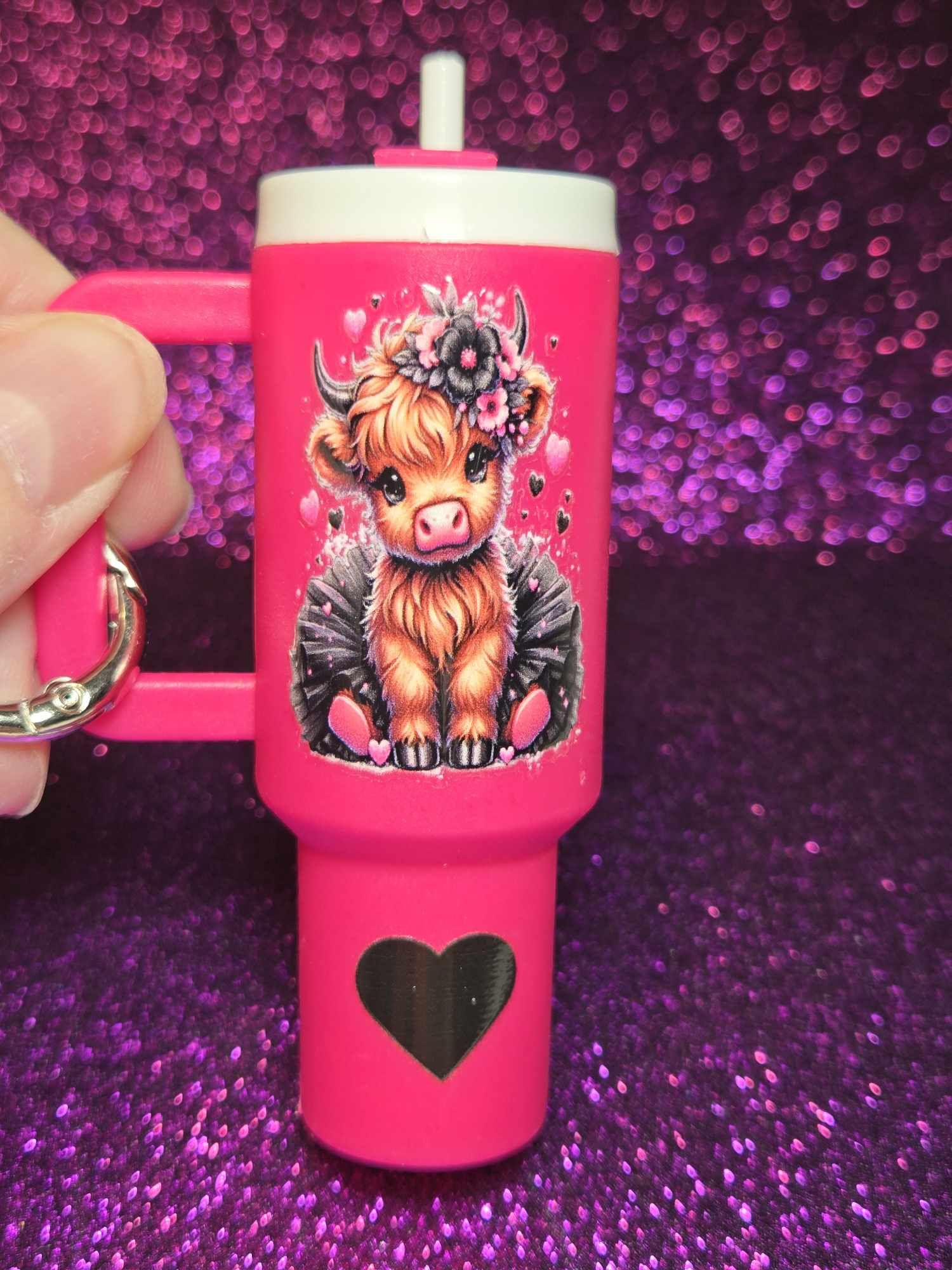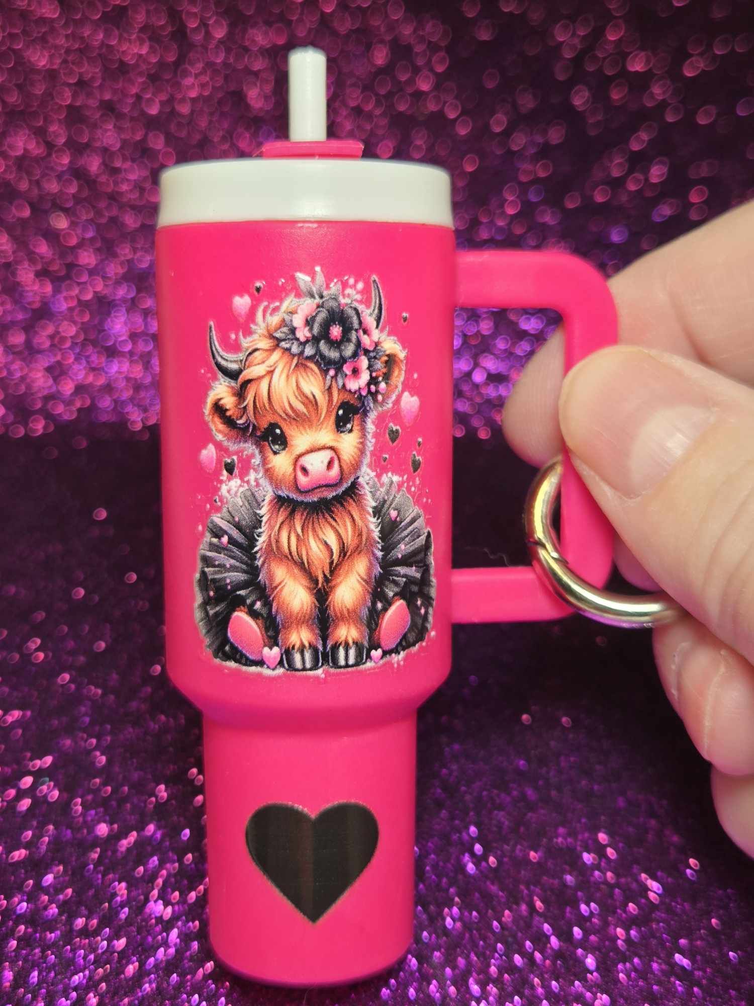 Brighten your day with the "Blooming Love Mini Tumbler Keychain", where charm and functionality meet in a burst of pink vibrance. This enchanting keychain features a sweet calf embellished with a floral crown, radiating joy from its pink-themed background. Ideal for those who adore a mix of cuteness and practicality, this mini tumbler is crafted with care to keep your keys organized while adding a pop of color. Equipped with a secure lid and sturdy key ring, it's the perfect on-the-go accessory for a quick errand or a thoughtful gift for someone special who loves adding a playful touch to their essentials.
