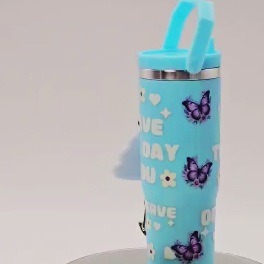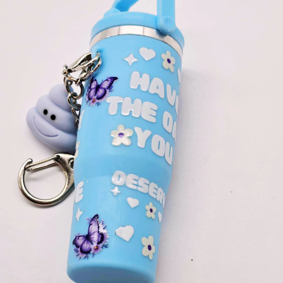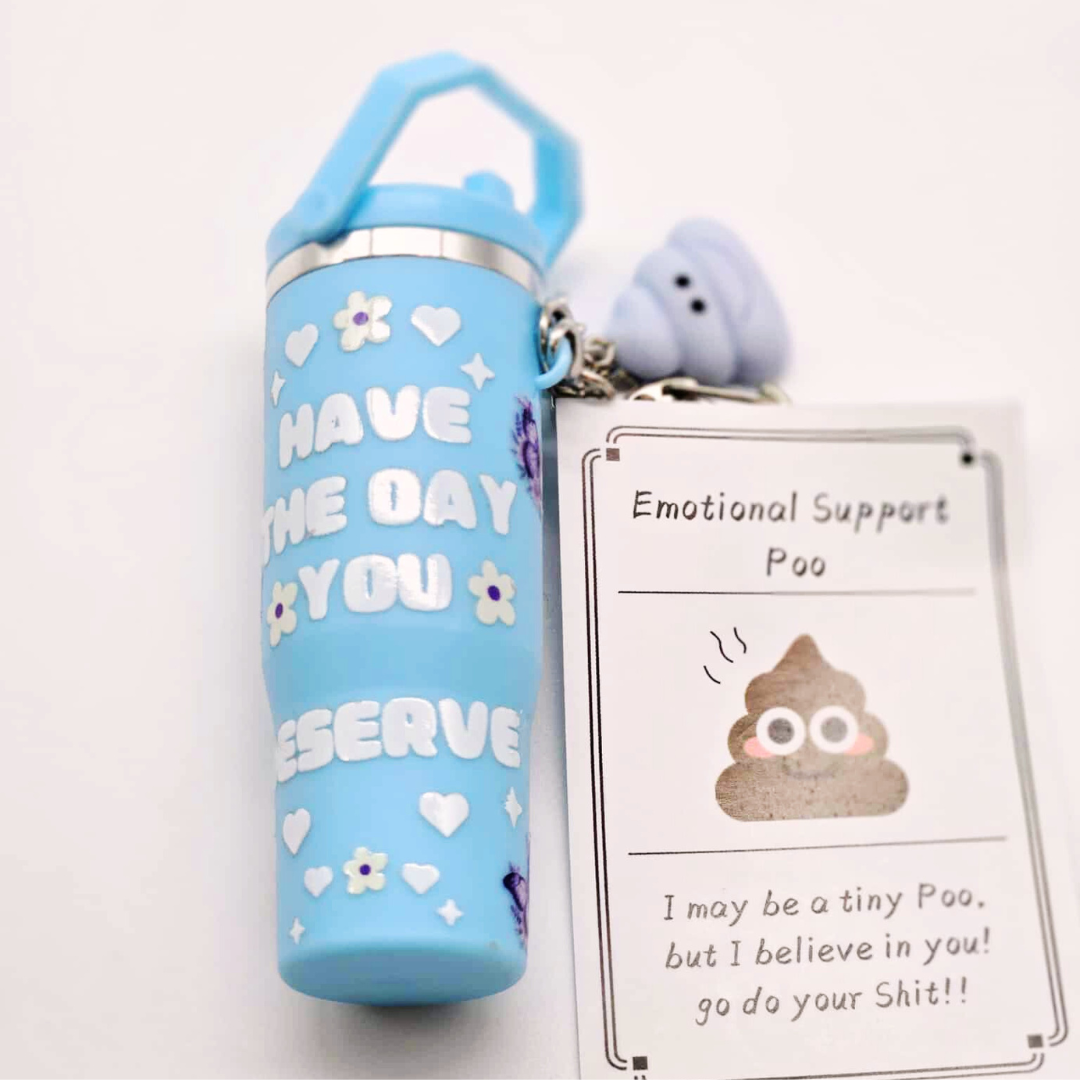 Bring a little positivity and fun with this Blue Butterfly Mini Tumbler Keychain! ๐๐ฆ Decorated with vibrant purple butterflies and the uplifting phrase โHave the Day You Deserve,โ this tumbler doubles as a chapstick holder (chapstick included) and tiny storage space for your must-haves. To make it even better, it comes with an Emotional Support Poo charm and card for a dose of encouragement wherever you go. Perfect for gifting, collecting, or adding a smile to your daily routine!