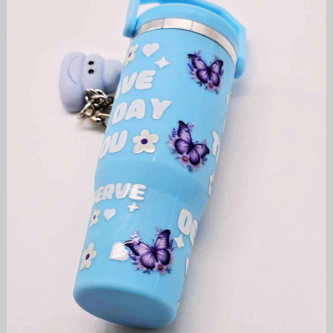 Blue Butterfly Mini Tumbler Keychain with Chapstick Holder & Emotional Support Poo Charm