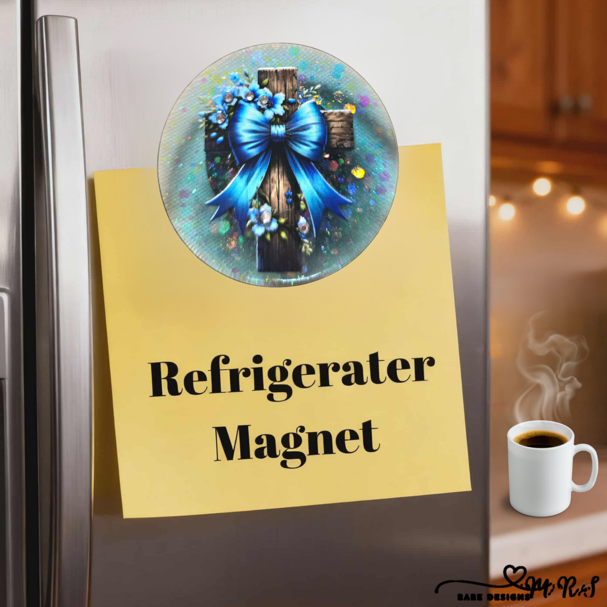 Add a touch of faith and beauty to your home with our Blue Floral Cross Refrigerator Magnet. This inspiring magnet features a rustic wooden cross adorned with a vibrant satin blue ribbon and delicate blue flowers, set against a shimmering background that brings light and reflection into any space. Perfect for displaying notes, photos, or favorite scriptures, it combines heartfelt symbolism with everyday functionality. Whether gifted to a loved one or placed on your own fridge, this magnet serves as a gentle reminder of hope, love, and grace in your daily life.