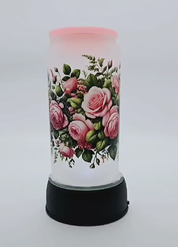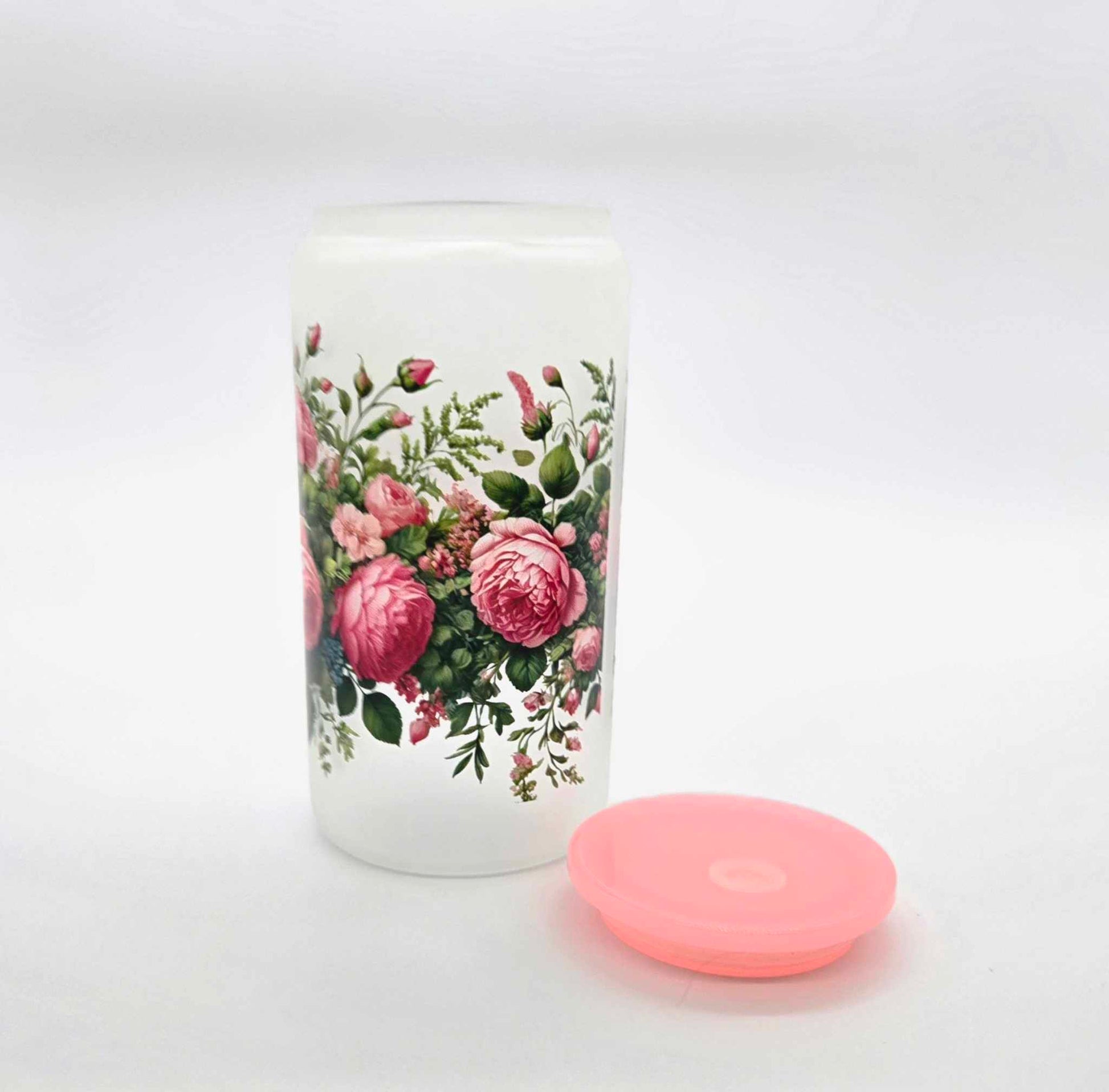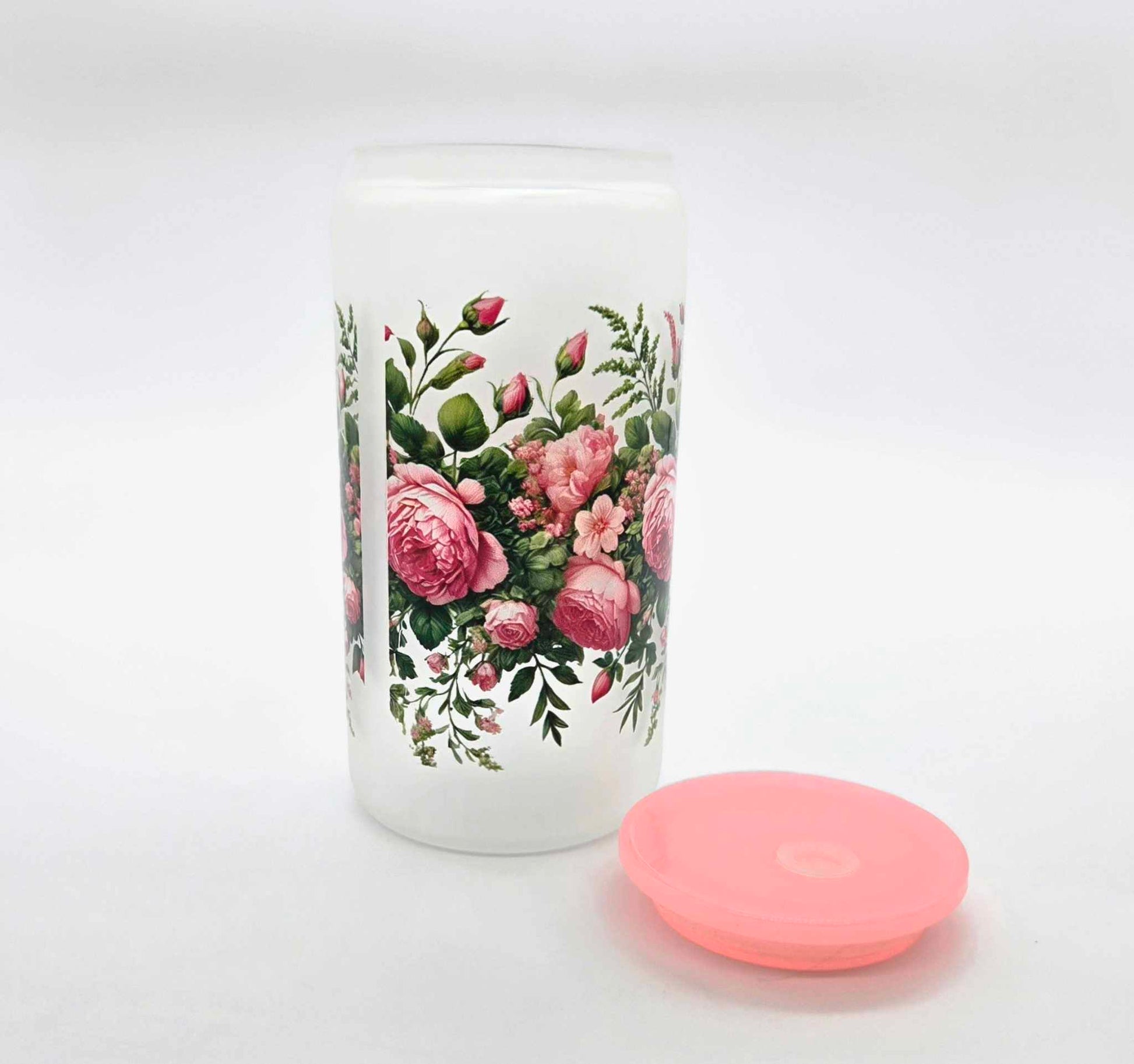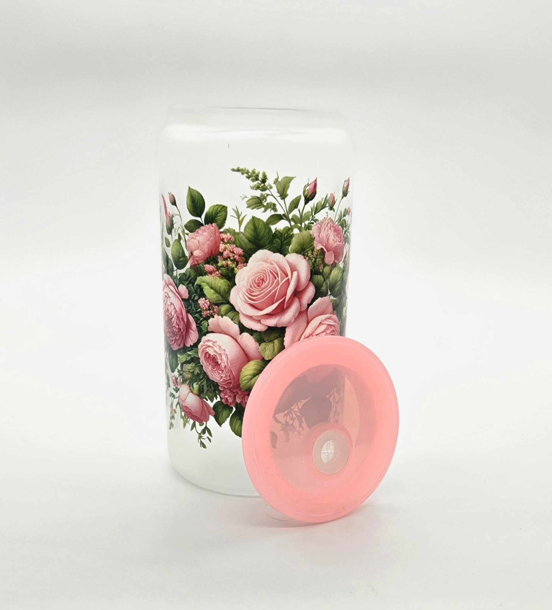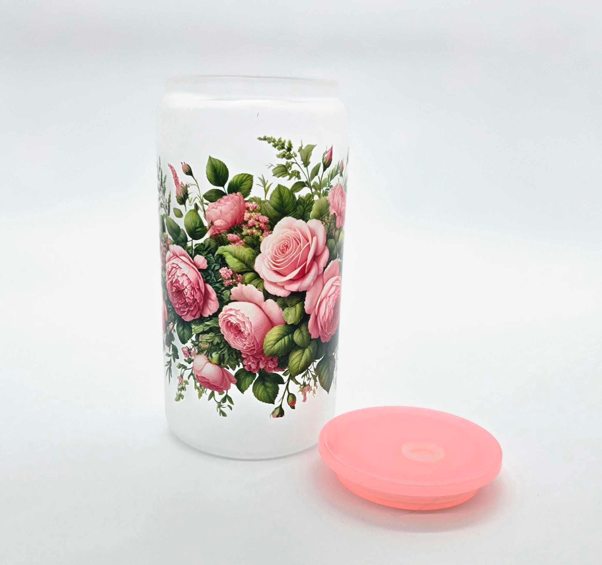 Wrap your hands around the timeless elegance of our Blushing Rose Garden Glass Tumbler! This 16oz frosted glass cup features a lush bouquet of pink roses, buds, and greenery blooming in full detail. The soft blush-pink silicone lid completes the romantic charm, making this the perfect tumbler for sipping something sweet in style.