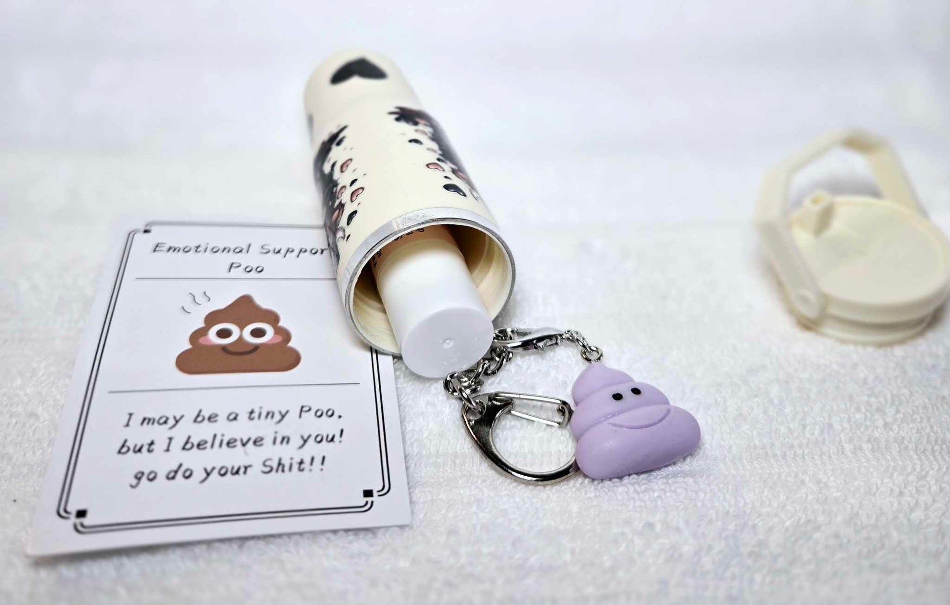 "Boost your morale with our 'Cheeky Support Keeper Keychain'! Featuring a light-hearted and uplifting 'Emotional Support Poo' charm, this keychain is designed to bring a smile and a bit of cheeky encouragement when you need it most. It's perfect for storing small necessities like money, ChapStick, or pills, and ensures you carry positivity everywhere you go. Each keychain includes a free ChapStick, making it a quirky and thoughtful gift for friends or for cheering yourself up on those tough days."