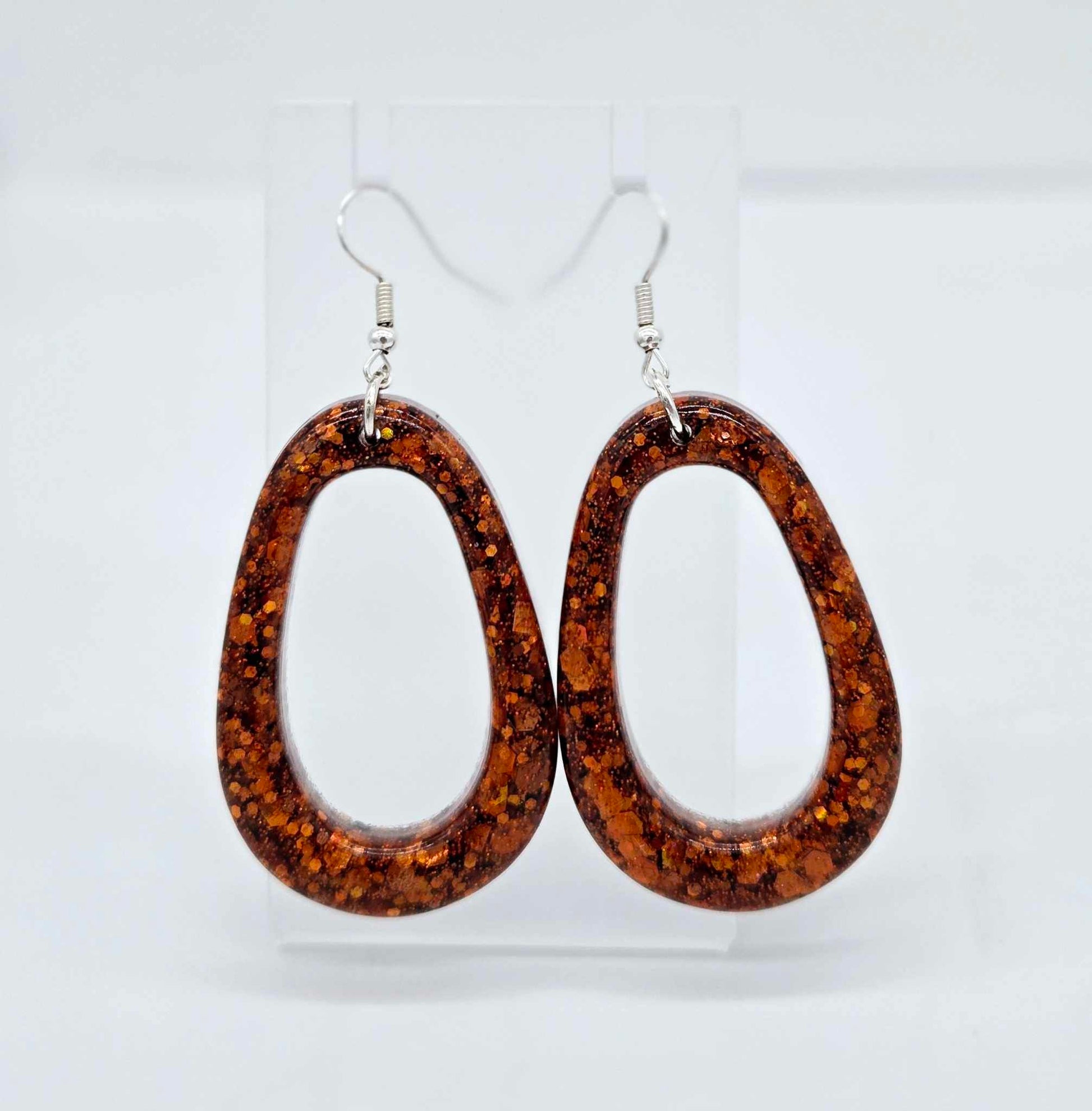 "Introducing our Copper Sparkle Oval Resin Earrings, where classic elegance meets modern sparkle. Each earring features an oval shape crafted from resin, embedded with shimmering copper flakes that catch the light with every turn. The warm, rich tones of copper bring a cozy yet luxurious feel, perfect for any season but especially lovely in the autumn months. Handmade at MRS Rare Designs, these earrings are not only a fashion statement but also a testament to unique artisan craftsmanship."