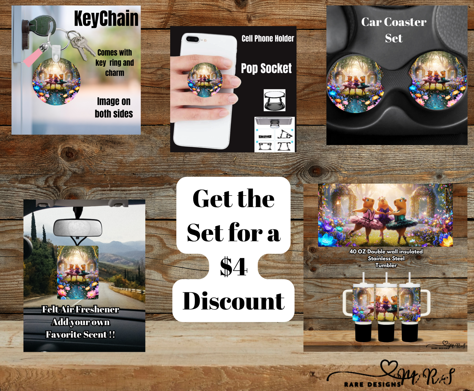 Make every day feel a little more magical with the Dancing Axolotls Enchanted 40oz Gift Set! This coordinated collection features our trio of ballerina axolotls twirling in a dreamy flower-filled forest and includes: a 40 oz double-wall insulated stainless steel tumbler with handle and straw, a double-sided keychain with charm, a felt air freshener you can scent with your own favorite fragrance, a car coaster set, and a phone grip pop socket. The tumbler keeps drinks hot or cold for hours, the car pieces brighten up your commute, and the phone grip and keychain add a fun, whimsical touch to your everyday essentials. Grab your favorite pieces individually or treat yourself (or someone special) to the full matching bundle and get a $4 discount when you buy the complete set!