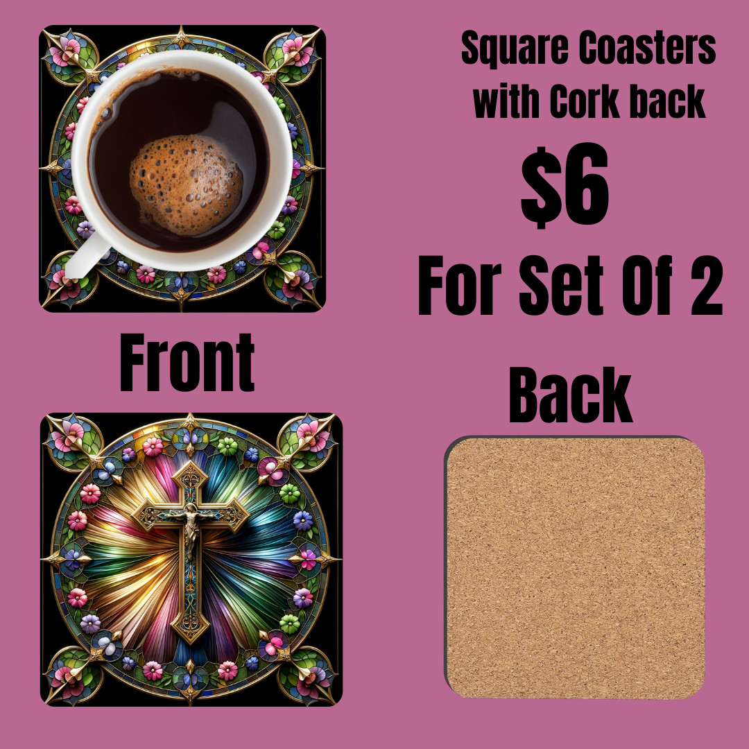 Introducing the Divine Radiance Coaster Collection – a perfect blend of spiritual beauty and practical elegance. These coasters feature intricate stained glass designs with vibrant colors and stunning detail. Each coaster in this set captures a different aspect of celestial and spiritual symbolism, adorned with radiant cross motifs surrounded by lush floral patterns and dazzling light effects. Crafted with a durable cork back to protect your surfaces, these coasters not only serve as a protective element for your furniture but also as a decorative piece that adds a touch of serenity and reverence to your home. Available in sets of two for just $6, they are an ideal choice for those who cherish artful expressions of faith and devotion.