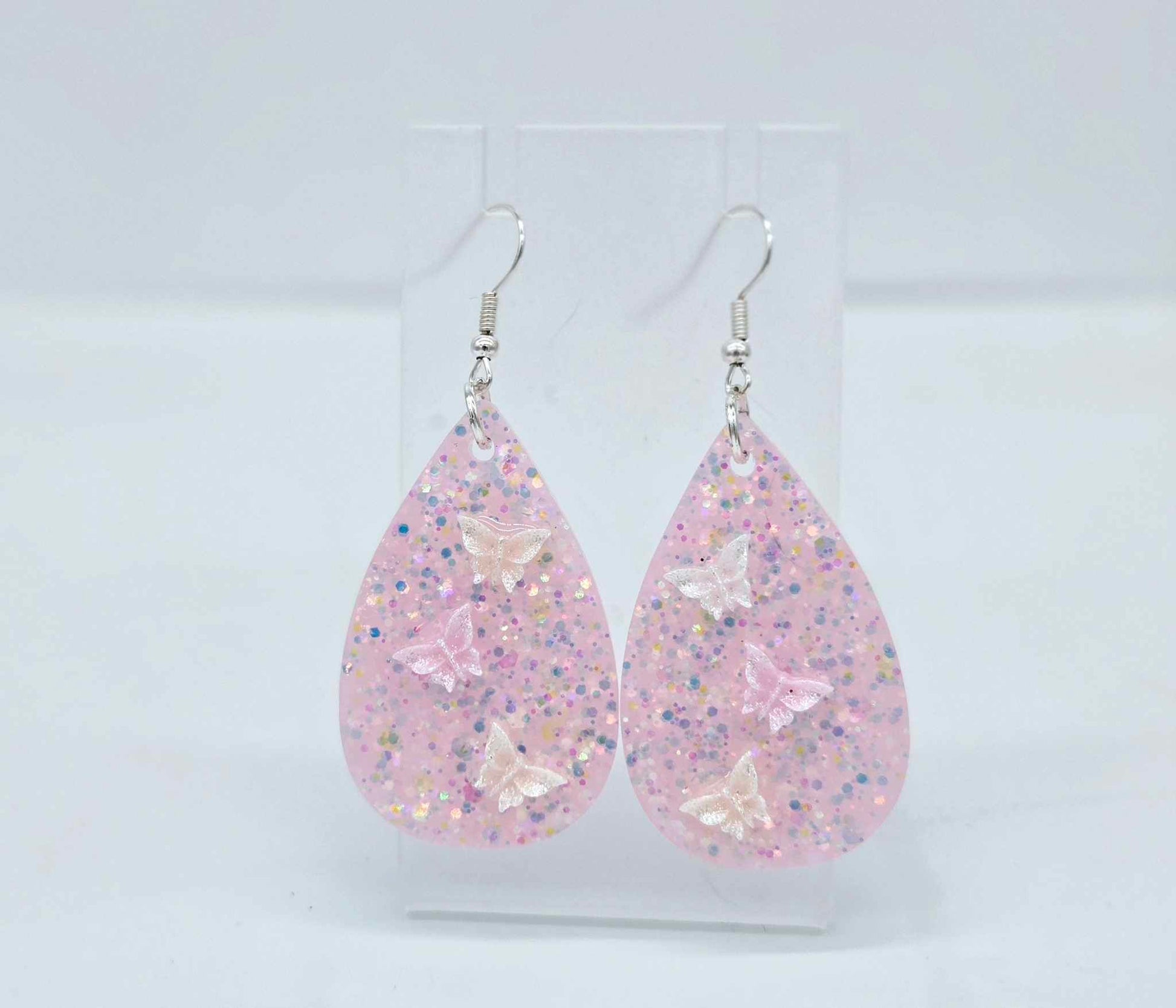 "Let your style soar with our Fairy Dust Butterfly Resin Earrings. Each earring is a gentle symphony of pastel pinks sprinkled with multicolored glitter that mimics the magical shimmer of fairy dust. Adorned with charming butterfly embellishments, these earrings capture the enchanting spirit of a whimsical garden. Perfectly crafted at MRS Rare Designs, they're designed to be light as air and enchanting to the eye, making them ideal for daily wear or special occasions where you wish to add a sprinkle of whimsy."