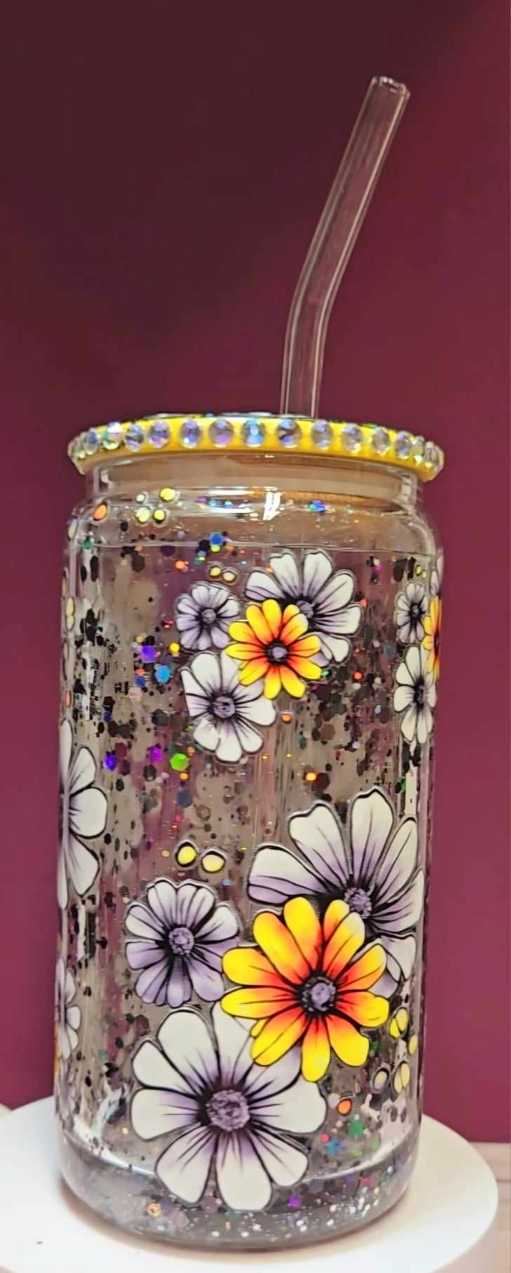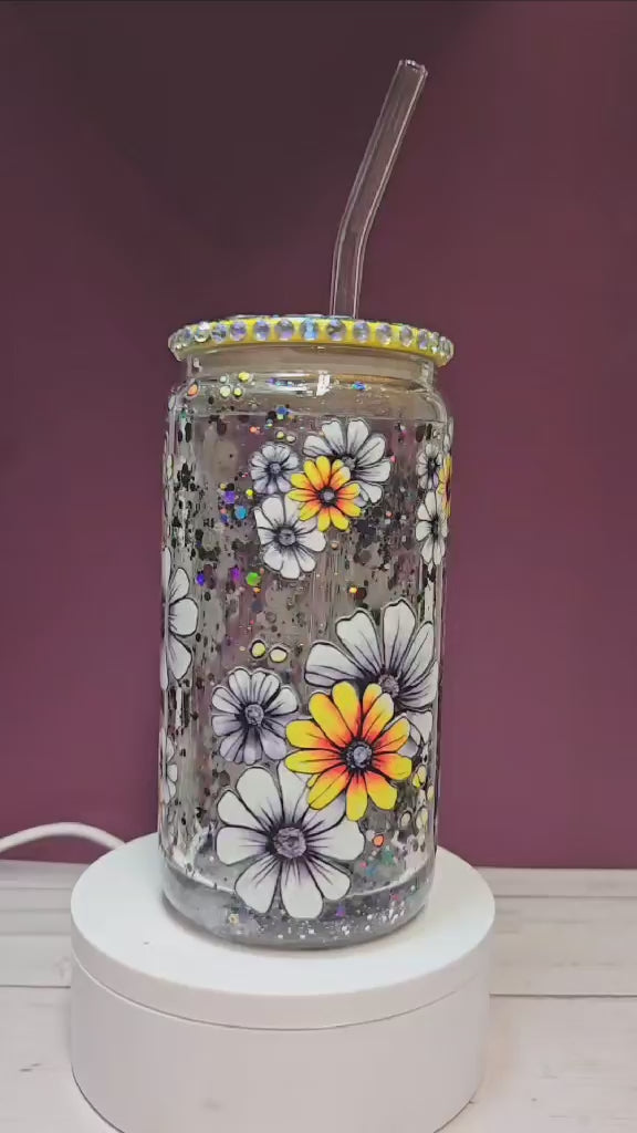 Brighten up your day with our Festive Floral Sparkle Snowglobe Tumbler, a perfect blend of elegance and fun! This double-walled acrylic tumbler features a stunning array of hand-painted flowers that dance amid a swirl of glitter, creating a mesmerizing snowglobe effect. The decorated lid, adorned with sparkling gems, adds a touch of glamor and sophistication. Whether you're sipping your favorite iced beverage or just showing off your style, this tumbler is sure to turn heads.