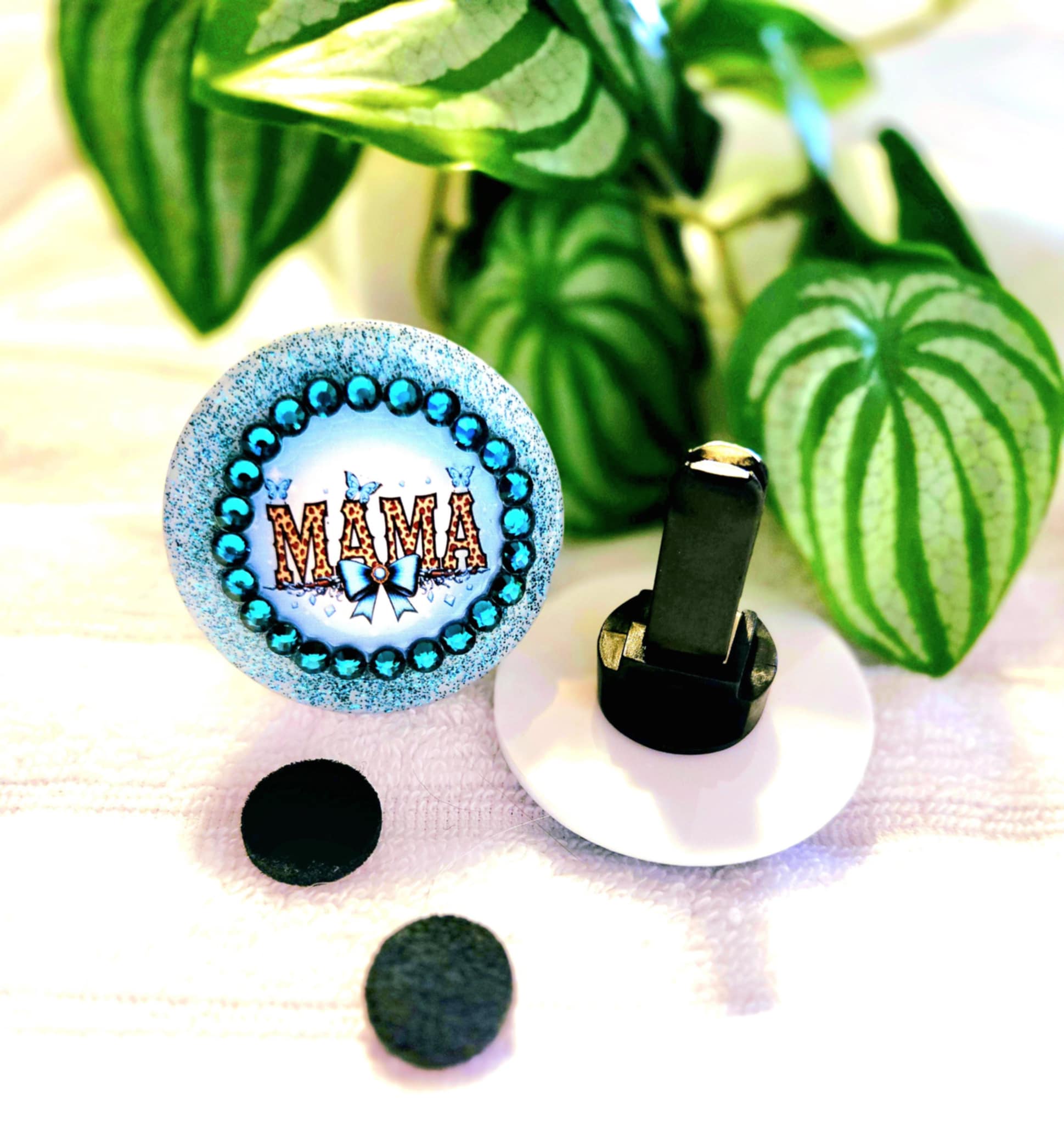 Turn every car ride into a moment of glam with our Glitz & Grace “MAMA” Scented Vent Clip! 💙 This handmade vent clip features dazzling teal rhinestones, bold leopard-print “MAMA” lettering, delicate butterflies, and a touch of glittery blue elegance. More than just pretty, it includes a reusable felt pad so you can add your favorite fragrance and keep your car smelling as fabulous as you are.