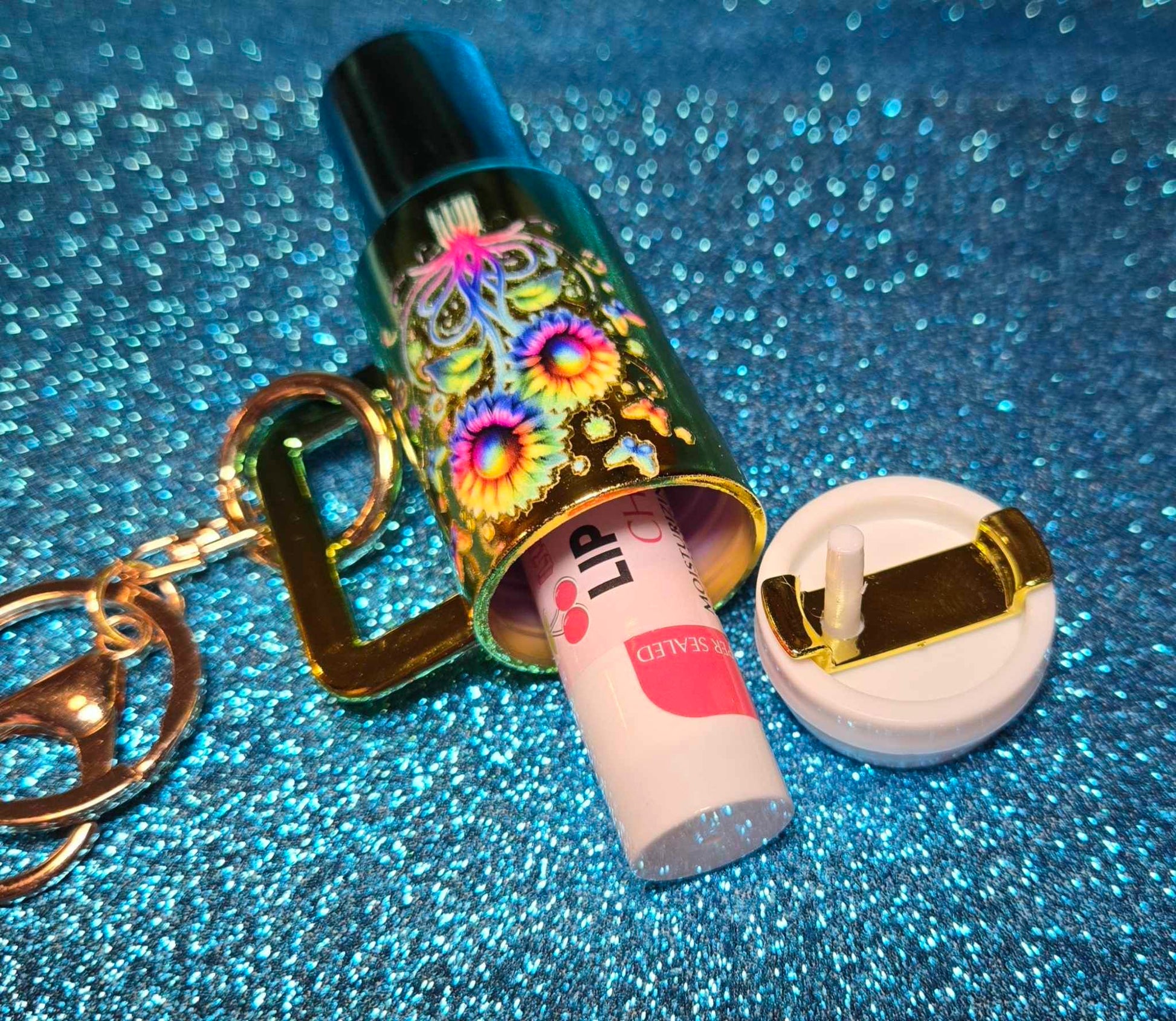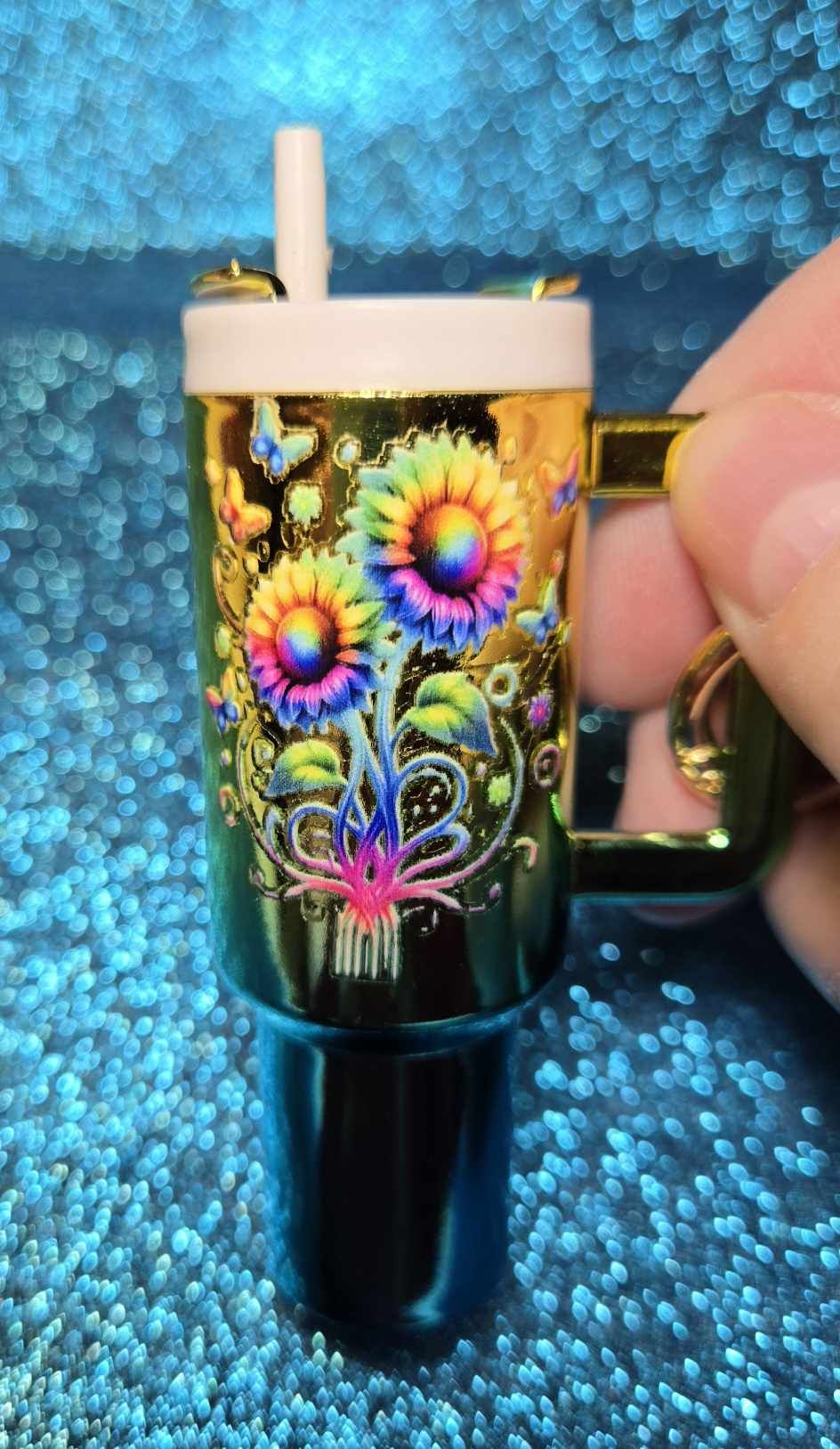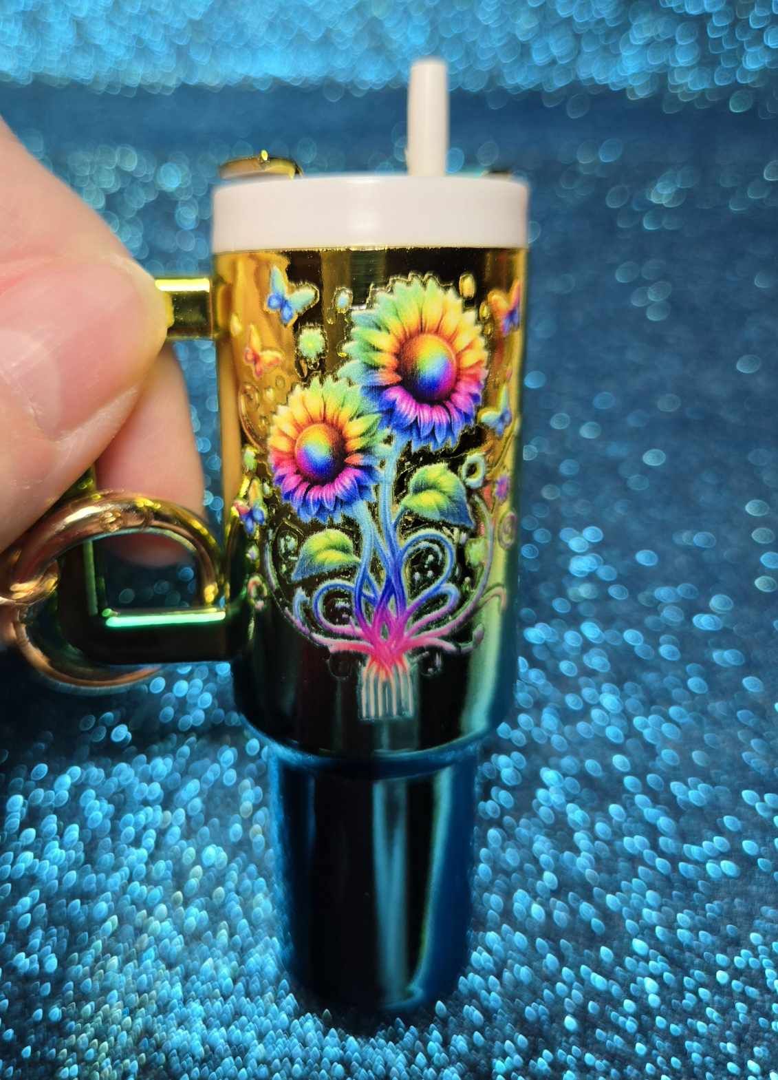 Elevate your accessory collection with our "Golden Bloom Mini Tumbler Keychain." This exquisite keychain showcases a stunning array of golden flowers bursting with vibrant colors, set against a gradient backdrop that transitions from rich gold to deep blue. Its elegant floral design is complemented by an intricate filigree pattern, making it a true piece of art. Perfect for those who love to add a touch of luxury and artistry to their everyday items, this keychain combines sophistication with functionality. It features a secure lid and a robust key ring, ideal for safeguarding your keys or as a glamorous gift for a special someone.