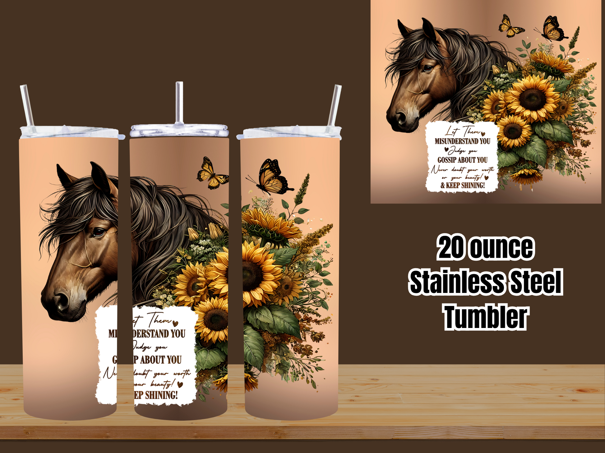 Stay inspired and stylish with our 20oz Horse & Sunflower Inspiration Stainless Steel Tumbler. Featuring a beautifully detailed horse portrait framed by golden sunflowers and fluttering butterflies, this tumbler also carries an uplifting quote that reminds you to stand strong, embrace your worth, and keep shining every day. 🌟