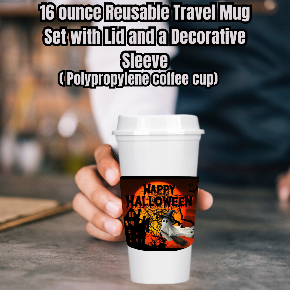 Sip your favorite coffee, cocoa, or spooky-season drink in style with our Haunted Brew Halloween Travel Mug Set! Each 16-ounce reusable polypropylene cup comes with a secure lid and a festive decorative sleeve featuring a glowing haunted house scene with a ghost and bats against a fiery orange moon. Available in classic white or sleek black, these eco-friendly mugs are perfect for commutes, office use, fall festivals, or Halloween parties. The reusable design makes them both sustainable and budget-friendly, while the seasonal sleeve adds just the right amount of frightful fun. Durable, lightweight, and easy to clean—these mugs are a must-have for every Halloween-loving coffee drinker!