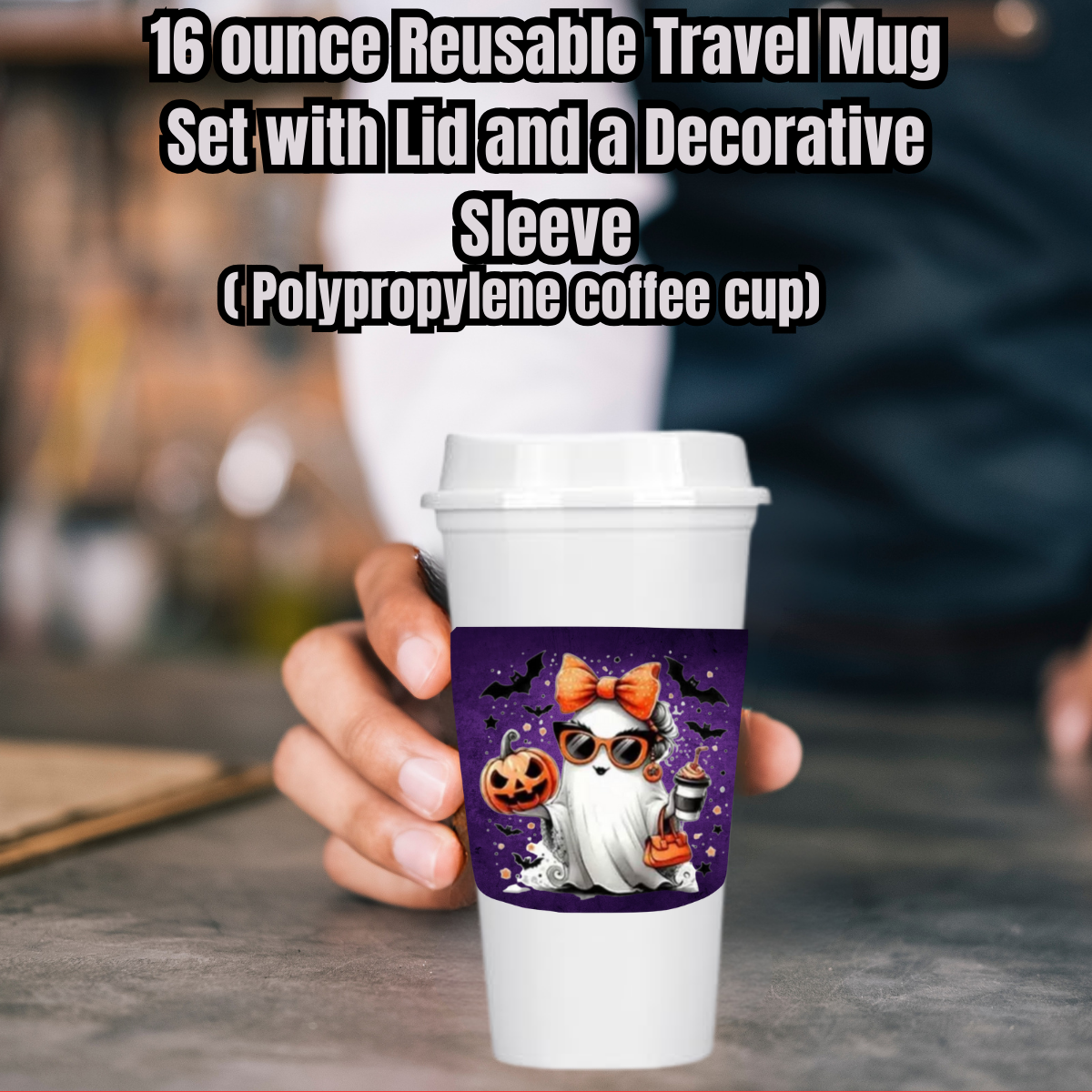 Bring some spooky style to your coffee routine with our Haunted Ghost Glam Travel Mug Collection! These 16-ounce polypropylene travel mugs are reusable, lightweight, and eco-friendly—perfect for your daily brew on the go. Each mug comes with a secure lid and a removable decorative sleeve featuring a stylish ghost complete with sunglasses, a pumpkin, and a festive bow.