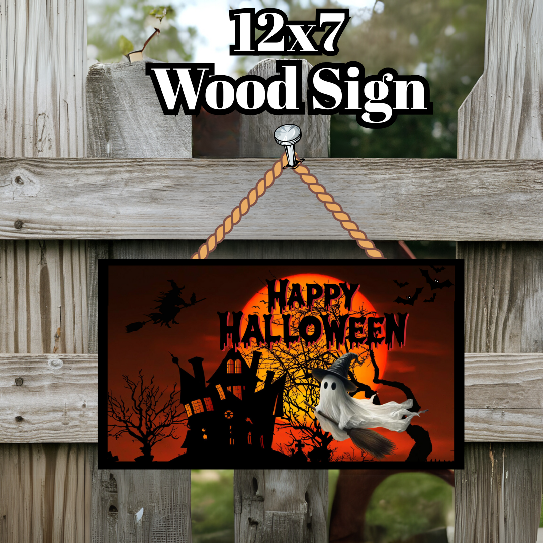 Bring a hauntingly fun touch to your home this spooky season with our 12x7 Haunted Halloween Ghost Wood Sign Collection. Each sign features vibrant, high-quality prints of flying ghosts, eerie haunted houses, glowing full moons, bats, and witches—capturing the perfect Halloween night vibe. Designed on durable wood, these signs come ready to hang with a rustic rope, making them the perfect addition for front doors, porches, fences, walls, or party décor. Whether you’re decorating for trick-or-treaters, hosting a Halloween bash, or just love seasonal décor, these spooky signs will set the perfect tone for a frightfully festive atmosphere.