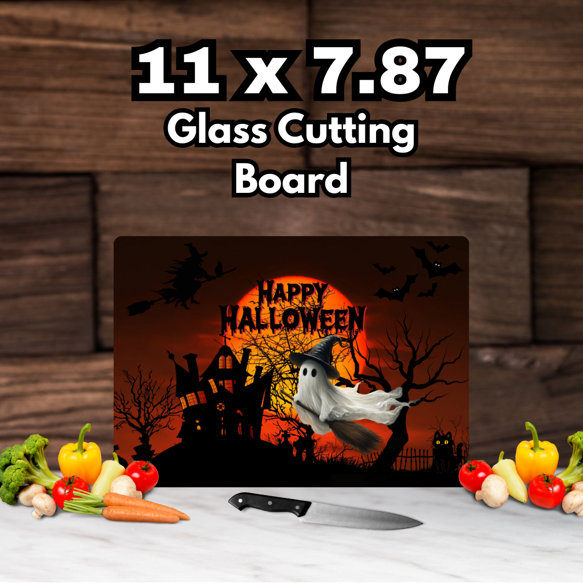 Bring spooky charm to your kitchen this Halloween with our Haunted Harvest Glass Cutting Boards. Each board measures 11 x 7.87 inches and features a hauntingly beautiful design with glowing orange moons, flying witches, spooky bats, and friendly little ghosts that set the perfect festive mood.