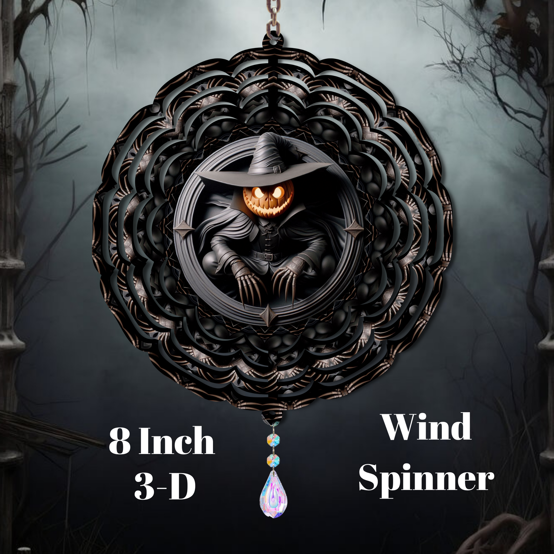 Bring a touch of spooky magic to your outdoor décor with our Haunted Harvest Pumpkin Wizard Wind Spinner. This 8-inch 3D spinner features a menacing pumpkin-headed sorcerer cloaked in shadows, perfectly designed to capture the spirit of Halloween. The intricate layered metal design creates a mesmerizing effect as it spins in the breeze, while the dangling crystal accent reflects light for an enchanting finish. Whether you hang it on your porch, in your garden, or indoors as a festive centerpiece, this wind spinner makes the perfect decoration for Halloween lovers, gothic décor fans, or anyone who enjoys unique seasonal art. Durable, lightweight, and hauntingly beautiful—it’s a must-have piece for your spooky collection!