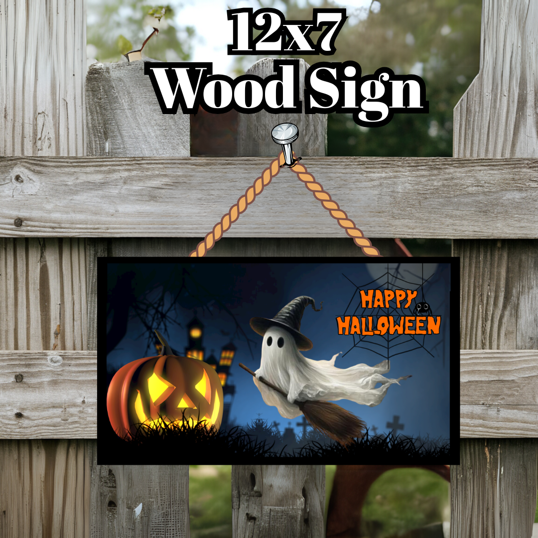 Bring spooky charm to your home with our Haunted Night Halloween Wood Sign Duo! Each 12x7 inch wood sign features a ghost flying on a broomstick with a glowing jack-o’-lantern under a moonlit sky. The designs include two festive variations of “Happy Halloween” lettering, making them perfect for adding a chilling yet fun touch to your Halloween décor. These signs are lightweight, durable, and easy to hang on doors, walls, porches, or fences. Ideal for both indoor and outdoor use, they make a festive addition to your seasonal decorations or a thoughtful Halloween gift.