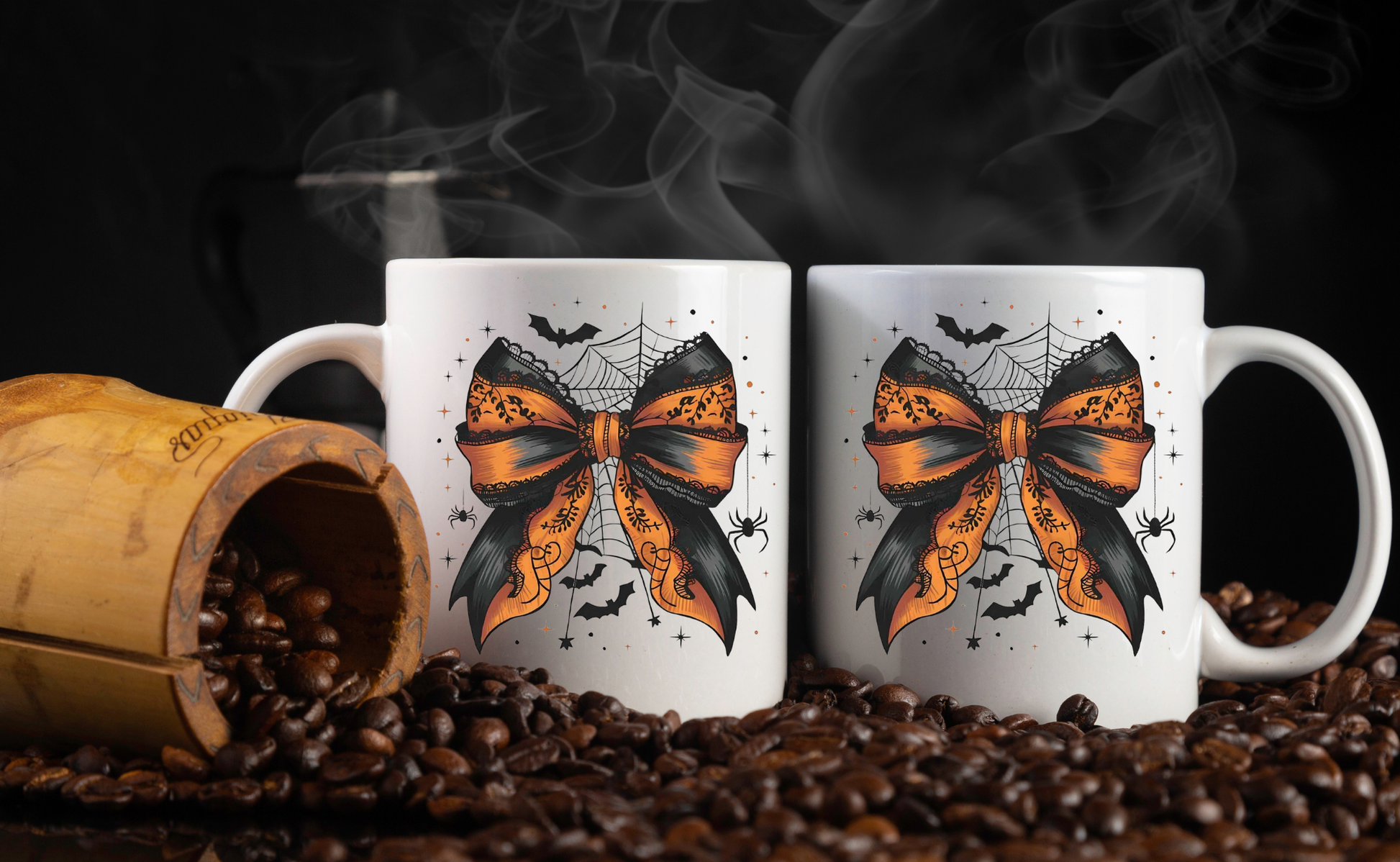 Sip your favorite brew in spooky style with our Hauntingly Chic Bow Mug Collection. These 11oz ceramic mugs feature bold Halloween bow designs—one in eerie black and silver with delicate spiderweb accents, and the other in classic orange and black adorned with bats, webs, and dangling spiders. Perfect for coffee, tea, or hot cocoa, these mugs bring just the right mix of elegance and spooky charm to your fall mornings. Whether you’re decorating for Halloween, gifting a friend, or treating yourself, these mugs are a must-have for any seasonal collection.