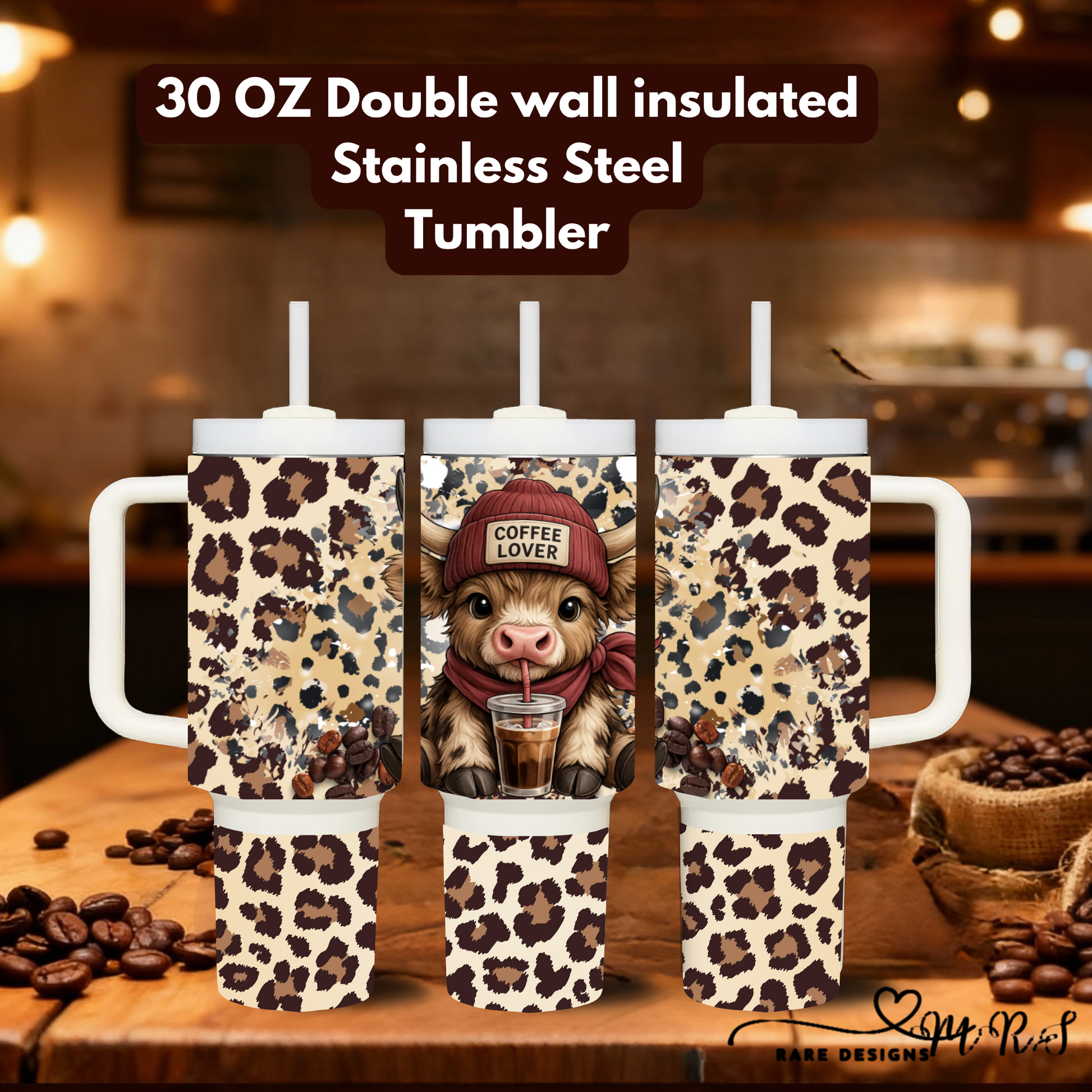 Carry your coffee in the cutest way possible with our Highland Cow Coffee Lover 30oz Handled Stainless Steel Tumblers. These adorable tumblers feature your choice of three highland cow designs—each sipping their favorite latte, iced coffee, or whipped drink—wrapped in a trendy leopard and coffee bean background.