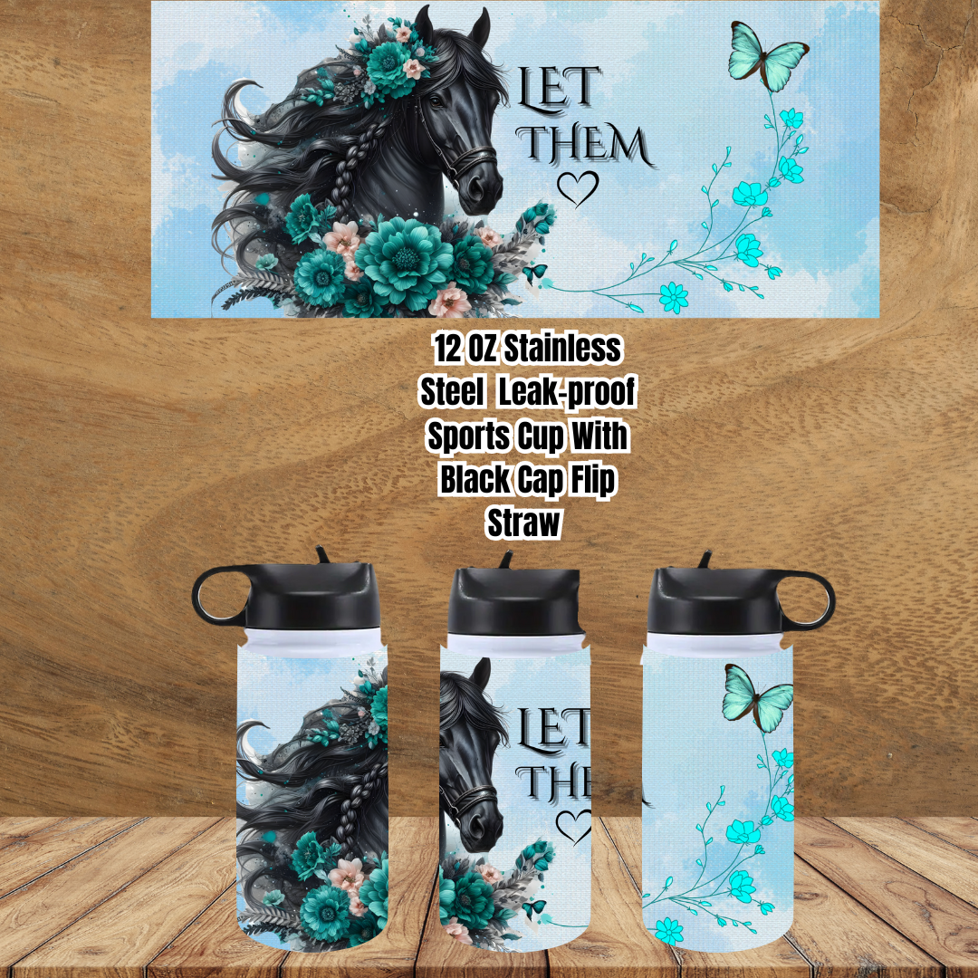 Our “Let Them” 12oz Stainless Steel Sports Cup is the perfect sidekick for little adventurers, gym-goers, and anyone who loves lightweight hydration with major personality. Featuring a powerful black horse, teal florals, and a fearless butterfly scene, this cup turns every sip into a statement.