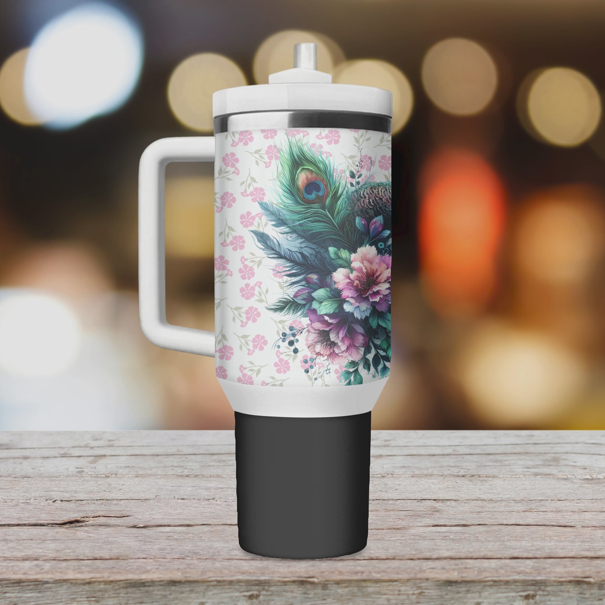 Make a bold, beautiful statement with the “Let Them” Peacock Bloom Tumbler. Featuring a vibrant peacock surrounded by lush florals and striking feathers, this 40 oz stainless steel tumbler is built for both beauty and performance. The double-wall insulation keeps your drinks hot or cold for hours, while the sturdy handle and straw lid make it perfect for sipping on the go.