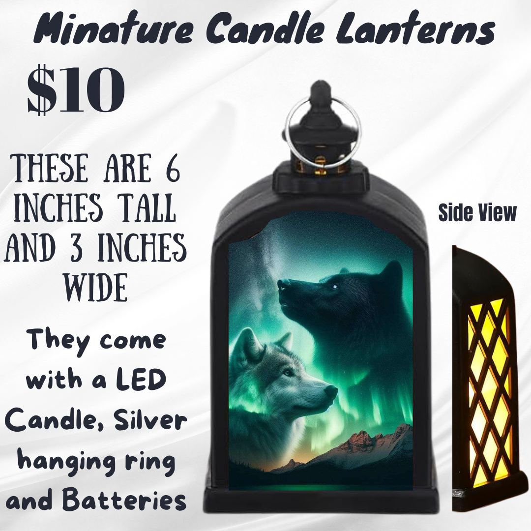 Embrace the mystical dance of the northern lights with our "Lupine Aurora LED Lantern." Measuring 6 inches in height and 3 inches in width, this LED-powered lantern is a pocket-sized homage to the majestic beauty of the wilderness. The silhouette of wolves against the shimmering aurora backdrop brings the spirit of the wild into your home. Complete with a gleaming silver hanging ring and long-lasting batteries, this lantern is priced at just $10 - a small token for a mesmerizing escape into nature's wonders.