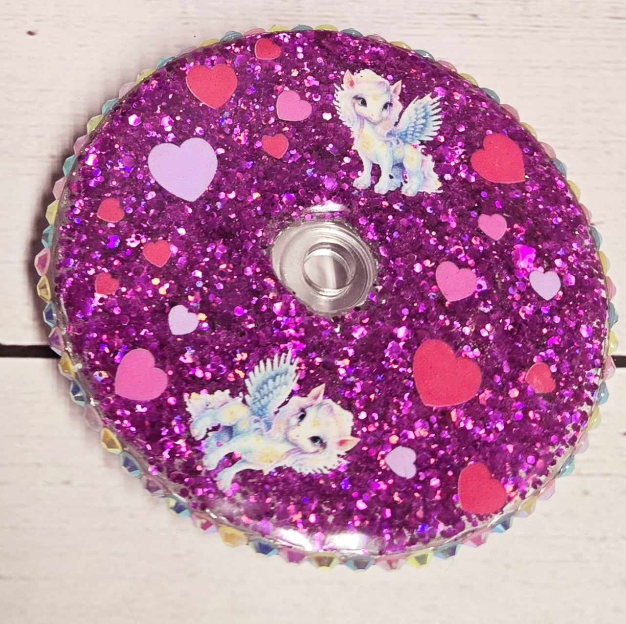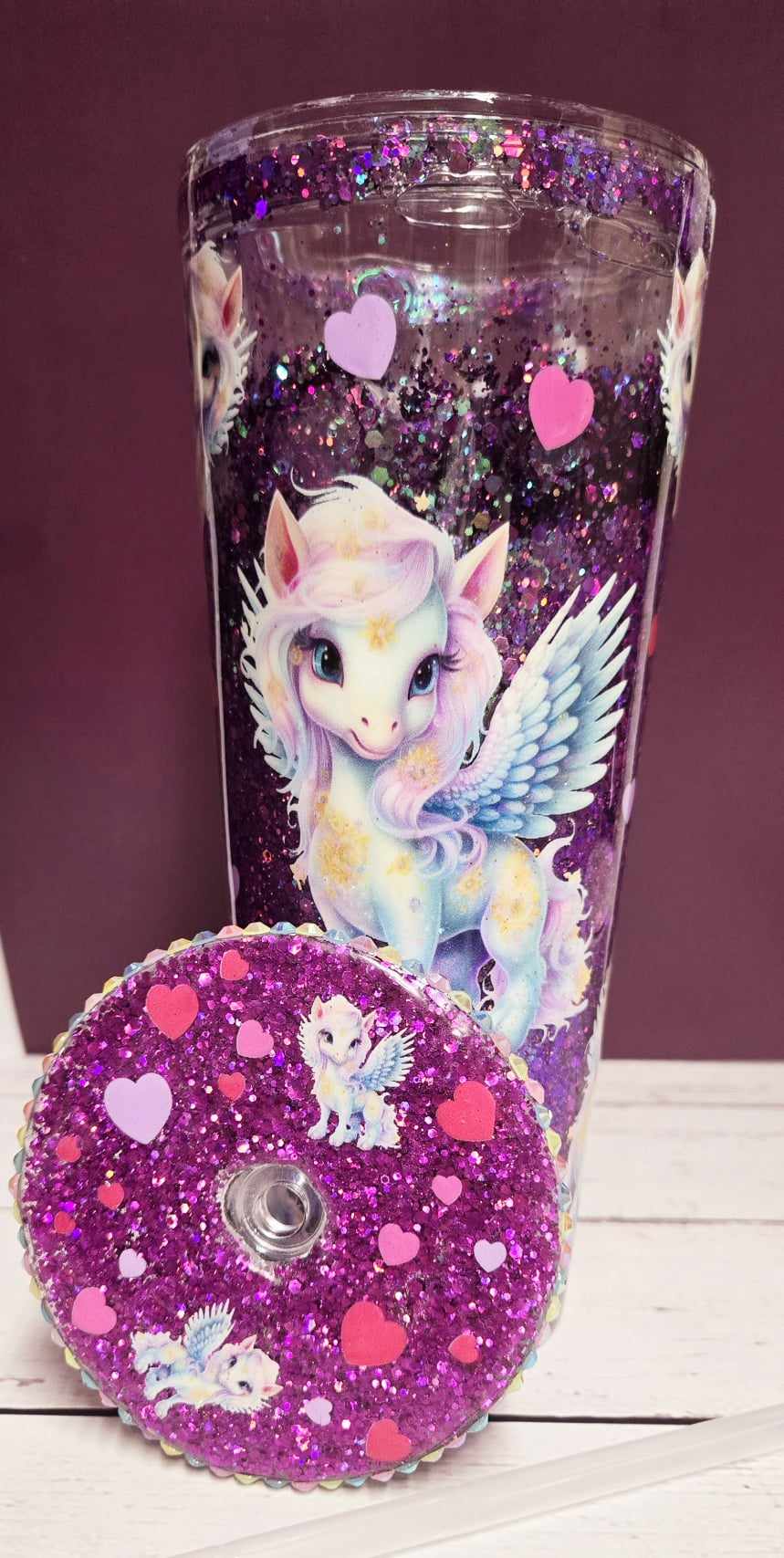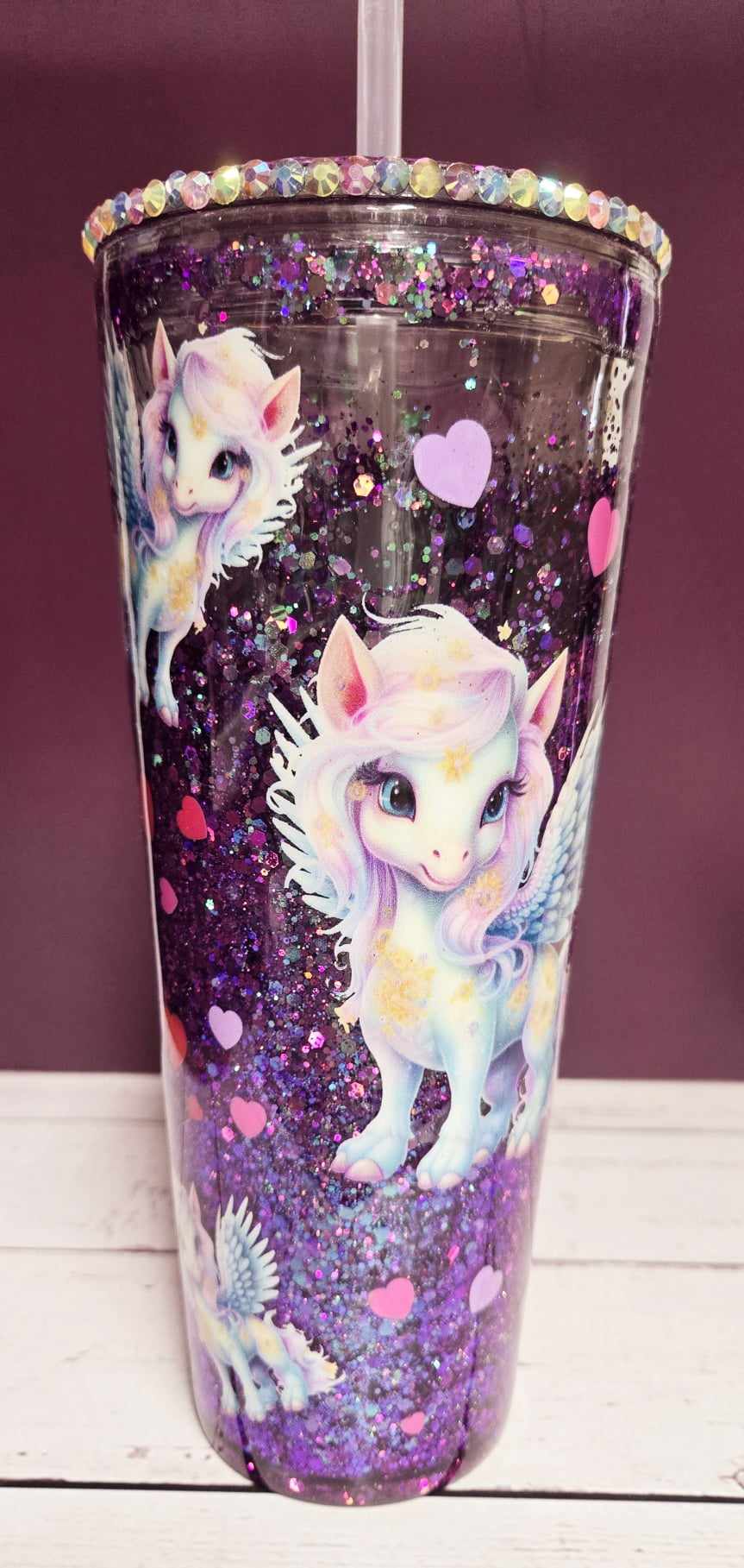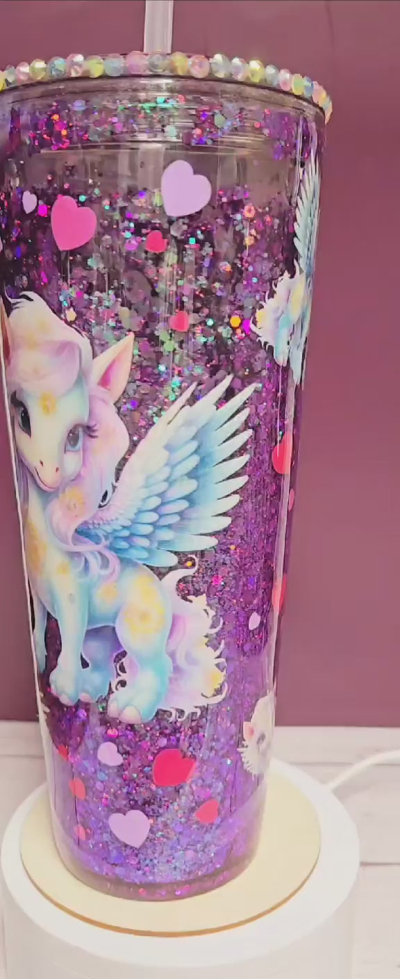Bring a touch of magic to your drinkware collection with our Magical Pegasus Snowglobe Tumbler! This stunning 24oz acrylic tumbler features an adorable winged Pegasus design, surrounded by shimmering purple glitter and cute pink hearts. The lid is adorned with a sparkling rhinestone band, adding an extra layer of glam. Perfect for cold drinks, this tumbler is double-walled to keep your beverages chilled for longer. Whether you're a lover of fantasy or simply want to add a bit of sparkle to your day, this tumbler is sure to become a favorite! Comes with a matching straw for sipping on the go. Not suitable for hot drinks.