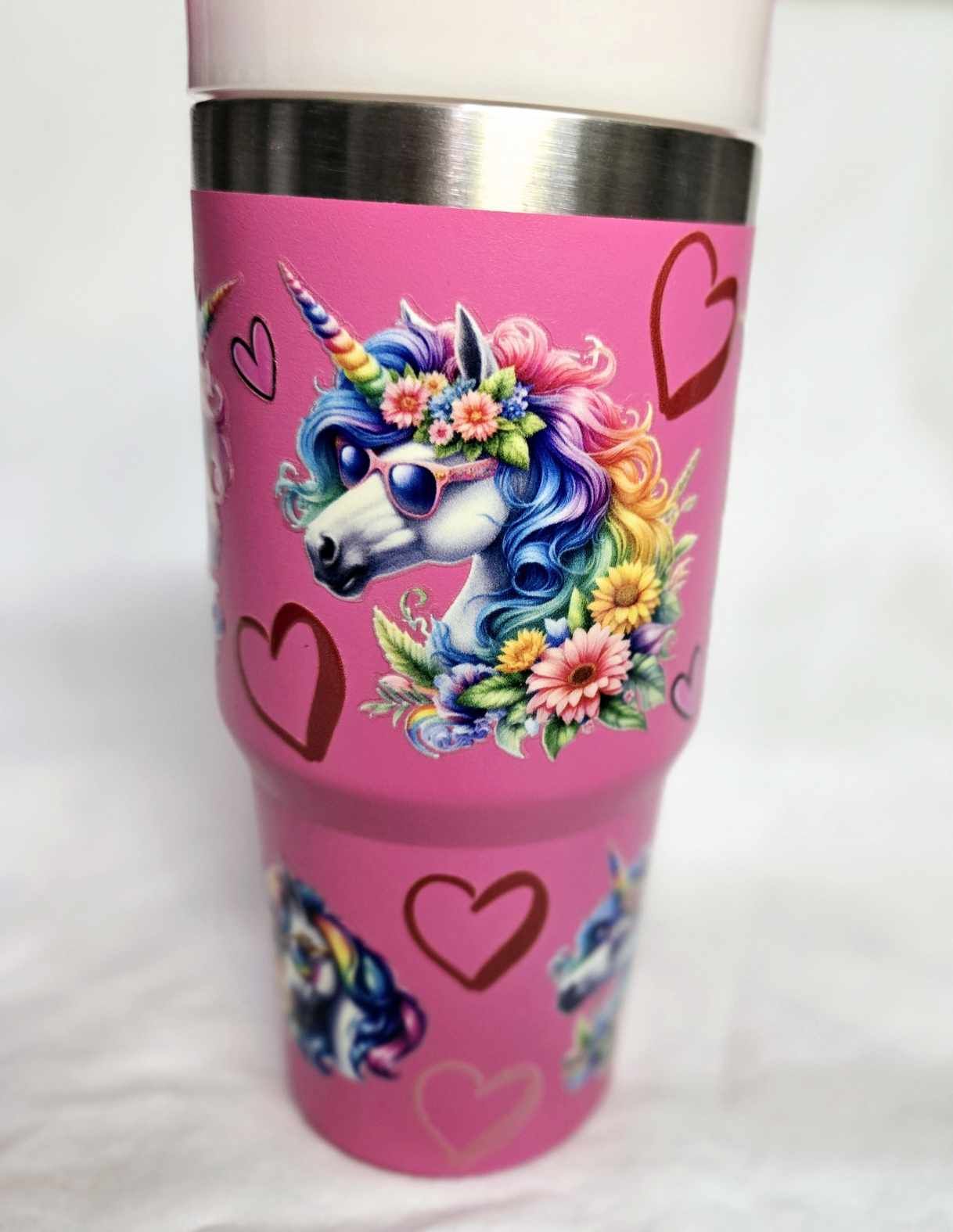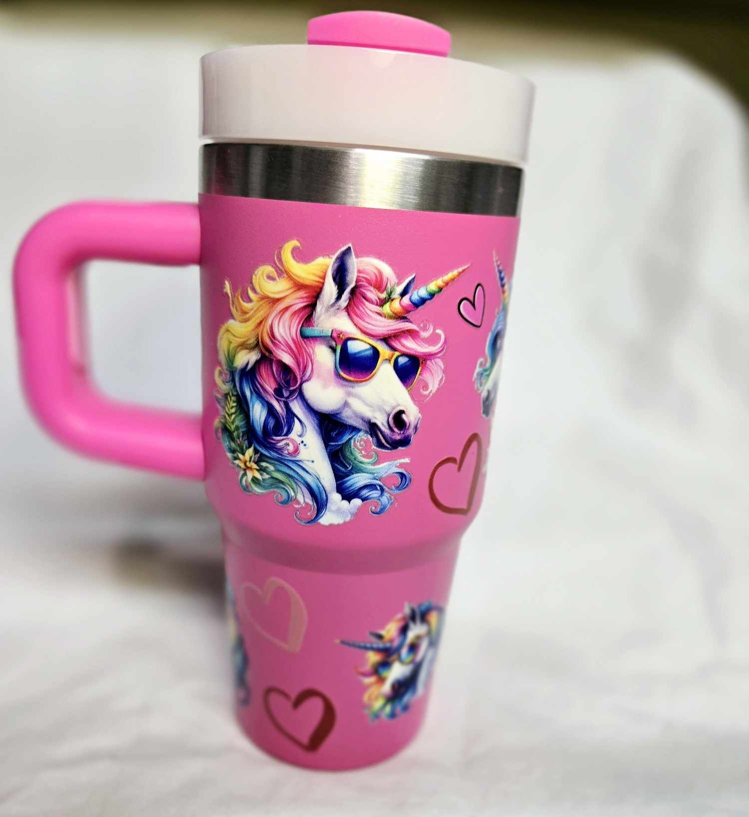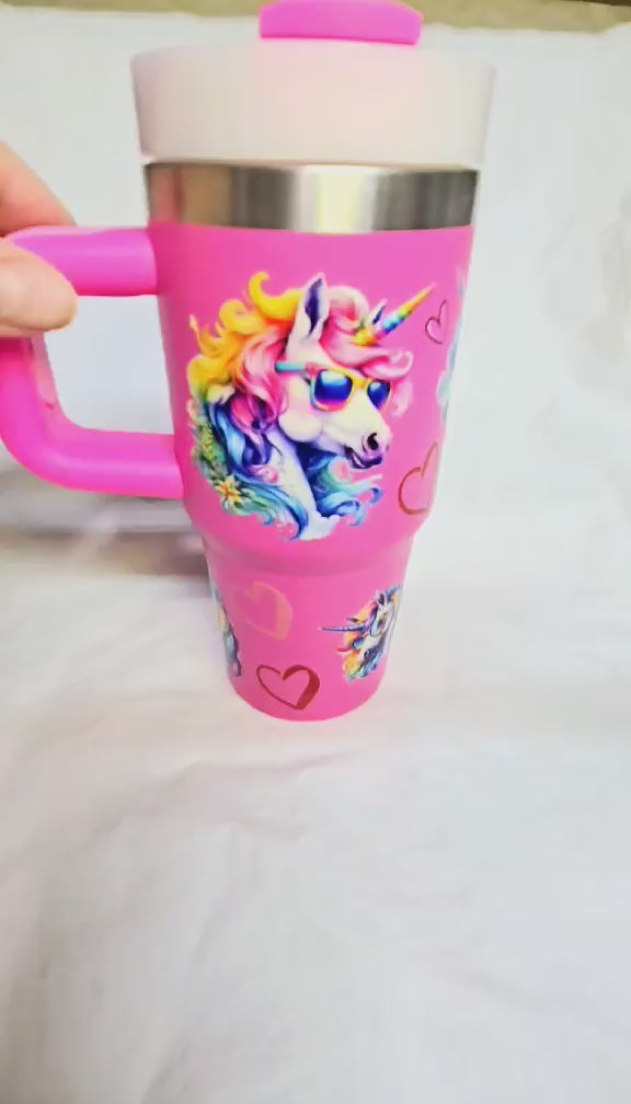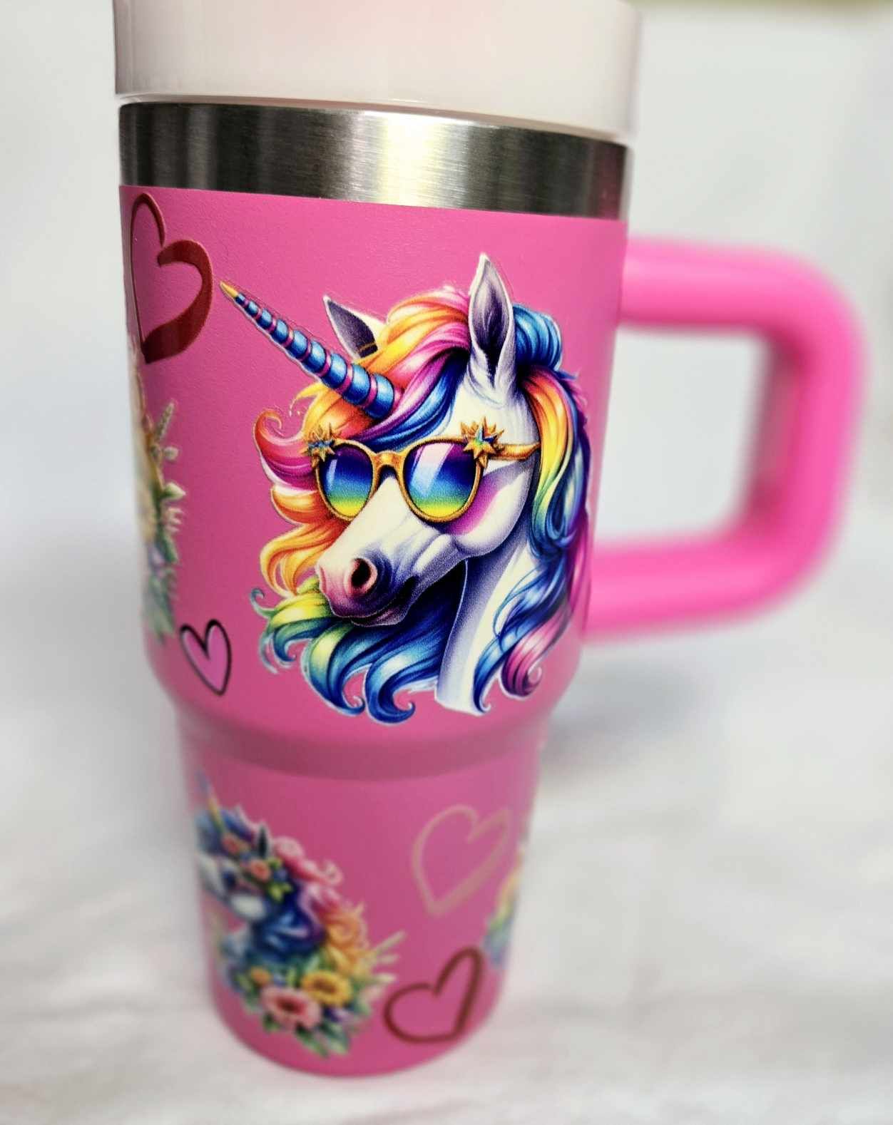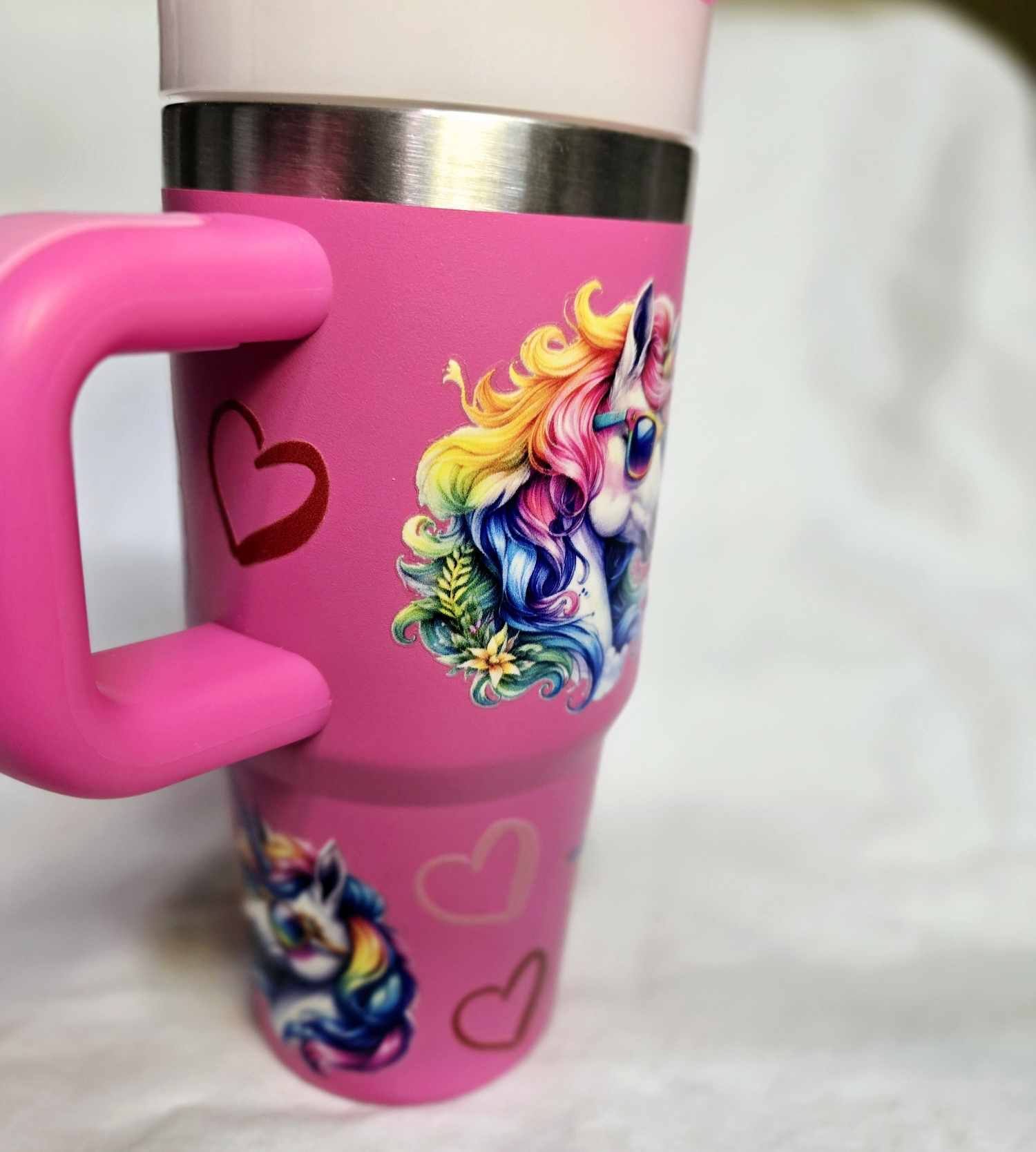 "Step into a world of magic with our Magical Unicorn Stainless Steel Tumbler — the perfect cup for little ones who dream big! This dazzling 14oz tumbler showcases a vibrant and colorful unicorn, complete with stylish sunglasses and a flowing rainbow mane, surrounded by hearts and flowers. Ideal for kids who want to sip like the grown-ups, it features a sturdy handle tailored for small hands and a secure lid with a straw, ensuring no magical potions spill during adventures. The double-wall insulation keeps drinks deliciously cold or comfortably warm, making it perfect for any season. Safe, fun, and BPA-free, this tumbler is just right for young dreamers looking to add a little unicorn magic to their day. Hand wash only to keep the magic alive longer!"