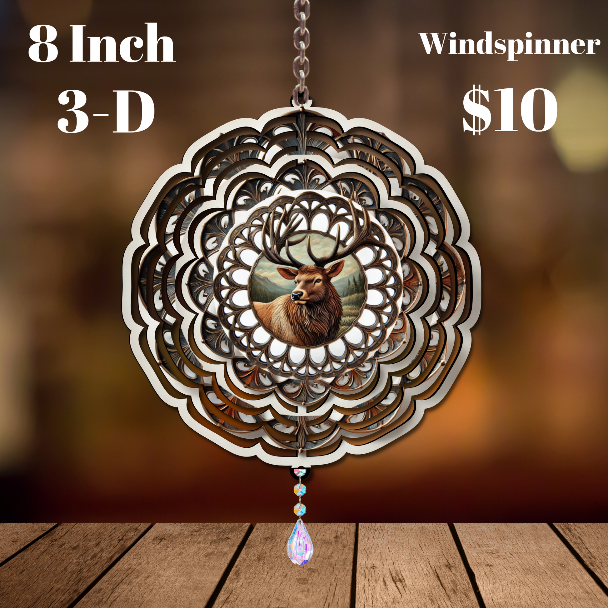 "Capture the serene beauty of the wilderness with our 'Majestic Wilderness Wind Spinners'. Each 8-inch spinner is crafted in stunning 3-D detail, featuring the elegance of a stag and the poise of a yak set against a backdrop of intricate metallic designs. The vibrant centerpiece is complemented by a sparkling crystal drop that dances with every breeze, adding a touch of wilderness charm to your outdoor or indoor spaces. Perfect for garden enthusiasts and wildlife admirers alike, these spinners are priced at just $10 each, offering a mesmerizing and affordable way to enhance your home's ambiance."
