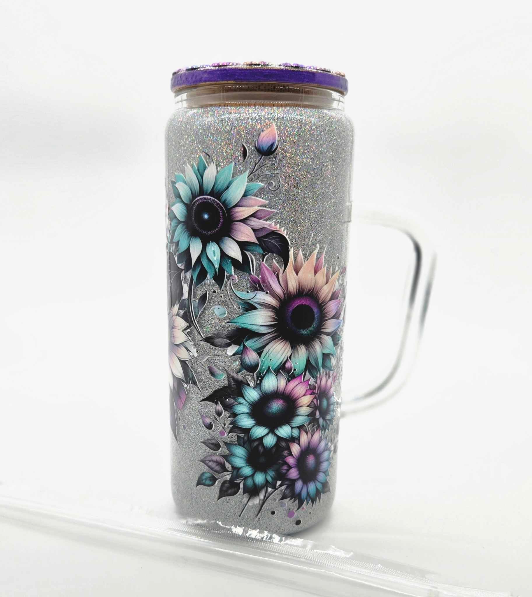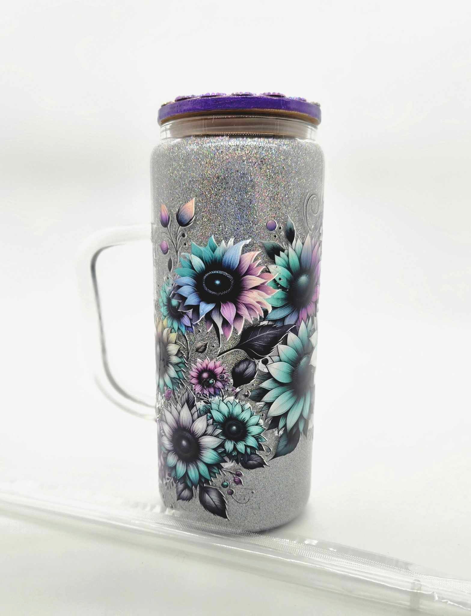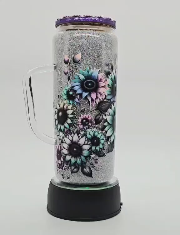Step into a world of shimmer and elegance with our Midnight Bloom Sparkle glass snow globe cup. This 20oz handled tumbler is a showstopper — featuring a cascade of pastel sunflowers in dreamy purples, soft blues, and radiant whites set against a silver glittered backdrop. The real magic? A sparkling snow globe effect that dances with every movement!